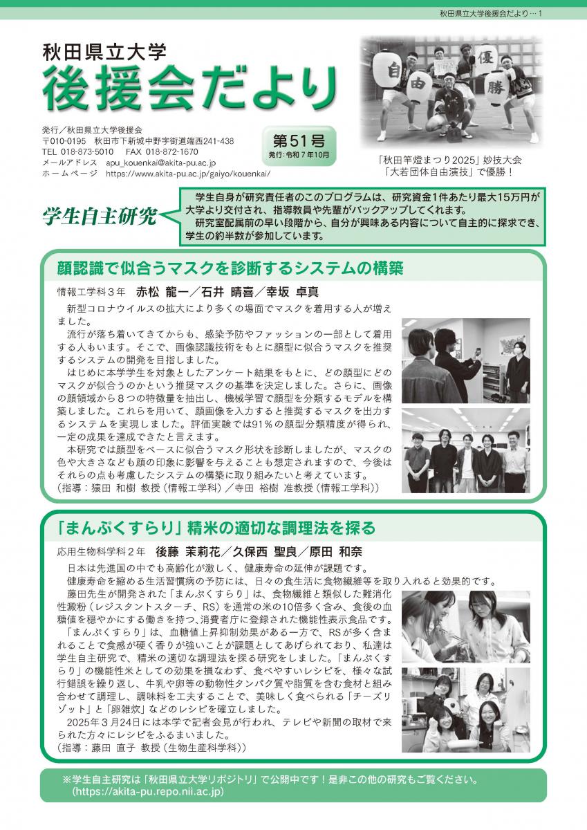 平成12年1月に学生がより充実した学生生活を送ることができるよう設立された秋田県立大学後援会の運営に携われることで、学生の日々の成長を近くから感じあえる喜びを思い切り楽しむ一年となれば最高です。