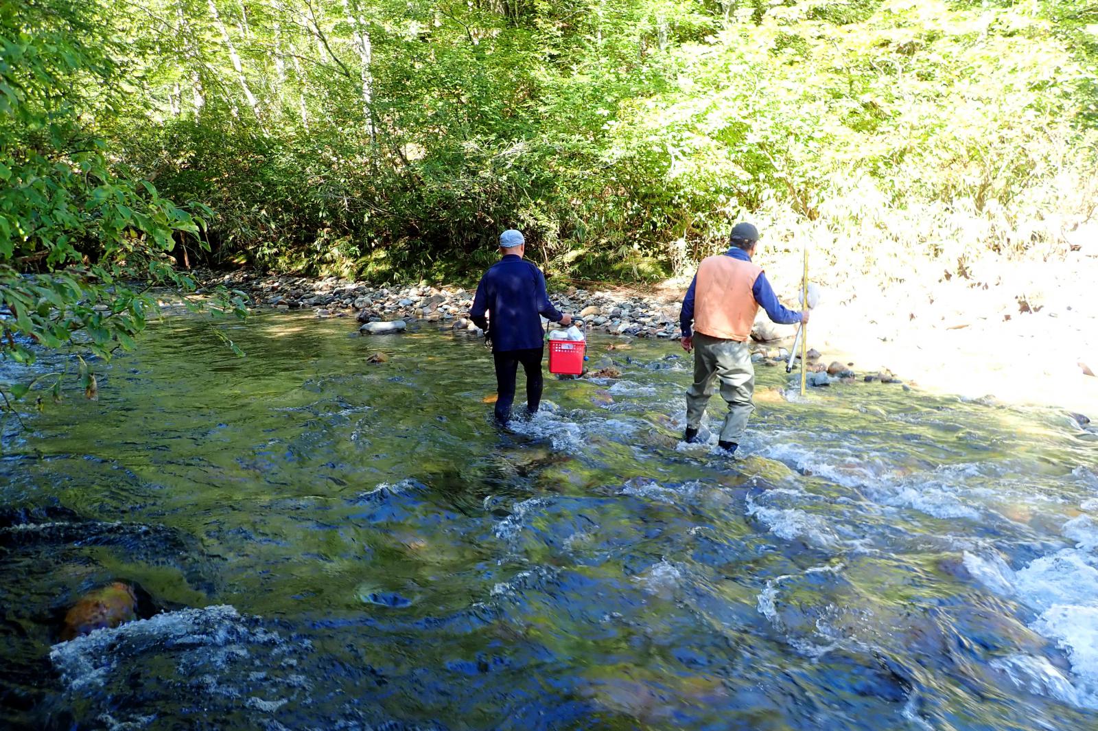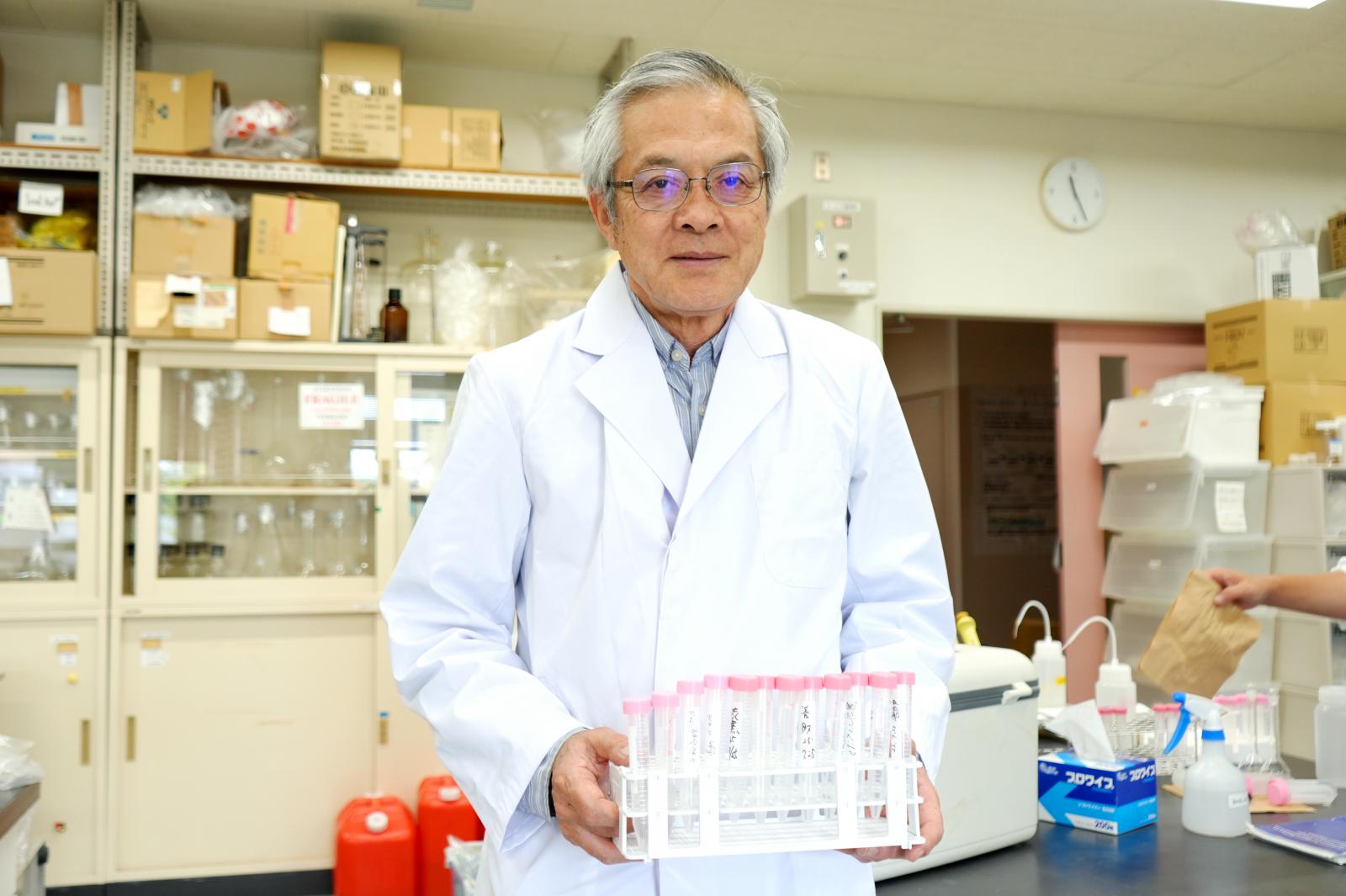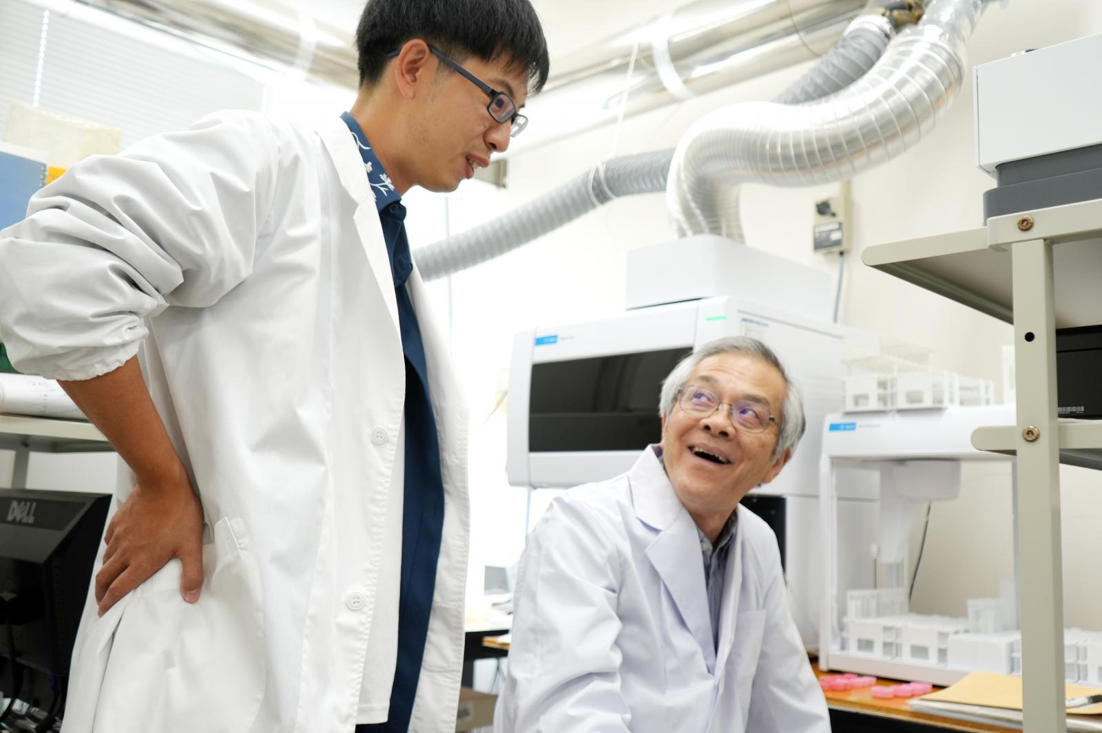 1ヶ月後に初めて担任した生徒たちの還暦の会があるというタイミングで受賞できて大変感激しております。この研究テーマは、49年前、山形大学理学部に在籍中、普通河川のトビケラの生活史に関する卒論研究の指導者であった横山宣雄先生から、「強酸性で有名な玉川温泉の流入河川には普通河川と全く異なる昆虫がいる」との情報をいただいたことが発端です。その2年後、中学生を連れて一緒にその川に調べに行きました。果たして、先生の話された通りの見たことのない幼虫がたくさんいる不思議な世界でした。直ぐにでも調査したいと思いましたが、大曲の自宅から車で往復4時間もかかるので、在職中は調べたいと思っても行く余裕はありませんでした。退職後、満を持して、調査に通い始めました。3年間調査を続けました。(※甲子園で金足農業高校の試合がある日は朝4時に起きました。)しかし、成虫がほとんど採集されず、雪解け前から初雪が降る頃まで孵化直後の1齢幼虫がみられるなど、いつ何回羽化するかさえ分からず、データの解析に頭を抱えました。これまで手掛けたトビケラとは全く異なり、本種の生活史の解析は、落とし物を拾いに行くような感じでした。そのときに、共著者になってくださった谷田一三先生(日本産水生昆虫検索図説の編者)から海外に同期性の低いトビケラがいることの情報など、多くの有益なご助言をいただいたことで、闇を脱し、前に進むことができました。実は、その谷田先生も横山先生と親交があり、谷田先生が座長をされた研究会に横山先生と一緒に参加した当時学生だった私のことを覚えていてくださって、44年後に学会でお会いした時に声をかけてくださったのでした。皆さんも、研究を通した人とのつながりを大事にしてください。いつかきっと、そのつながりが役に立つことがあると思います。いつも、多くのアドバイスをいただき、親身になって相談に乗ってくださる早川敦先生、そして、こんな年になっても好きなことをやらせてくれている妻にはとても感謝しています。[左]受賞した青谷 晃吉さん [右]早川 敦 教授