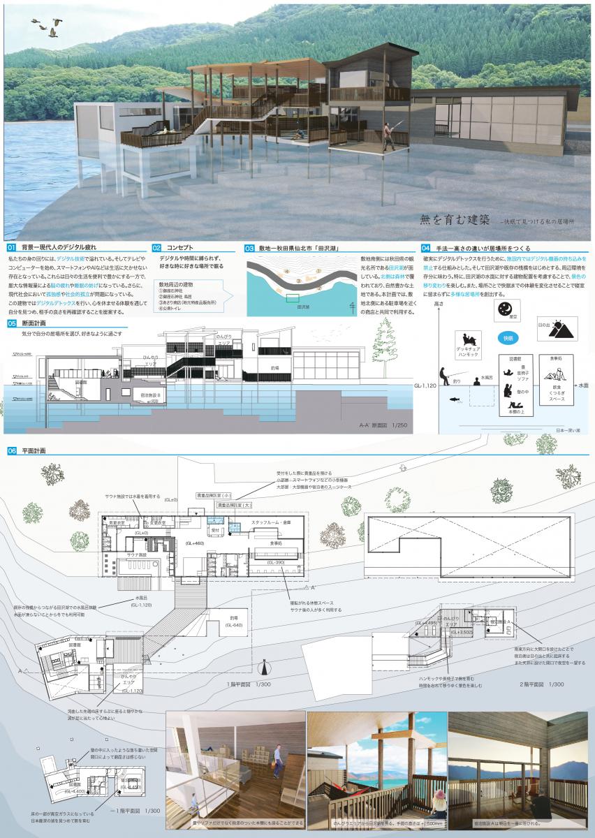 「Asahi学生デザインコンペティション」(朝日生命保険相互会社)は、国内の学生を対象に日頃の学習成果や課題解決力を発信・表現する場の提供を目的として開催されているもので、第3回目となる今回は、「〇〇を育む建築」がテーマでした。システム科学技術学部建築環境システム学科3年 新野瑞樹さんの作品「無を育む建築 -快眠で見つける私の居場所」は、眠りにいざなうさまざまな空間を提案し、計103点もの応募作品の中から入賞に選ばれました。