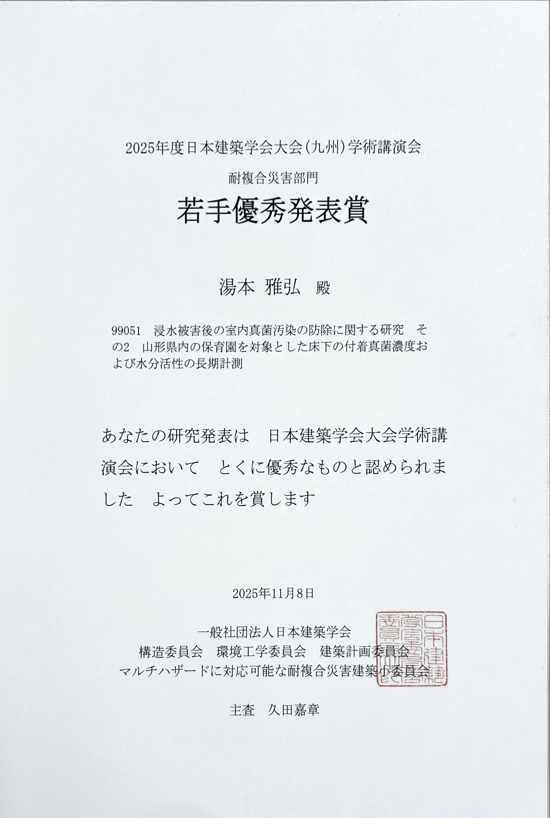 現在,システム科学技術研究科総合システム工学専攻,環境計画学研究グループに所属している大学院生・湯本雅弘さんの発表論文「浸水被害後の室内真菌汚染の防除に関する研究 その2 山形県内の保育園を対象とした床下の付着真菌濃度および水分活性の長期計測」が