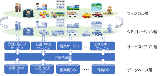 情報ネットワーク研究室で既に実装している地域情報共有システムや乗り合い交通予約システムと共存できる新しいサービス基盤が必要となります。また、秋田版スマート農業モデル創出事業(交付金研究プロジェクト)の7つのテーマを統合・俯瞰する情報基盤、アプリ基盤の最適化が求められます。本研究室では、図に示すような「Society5.0」に基づく実装構造(アーキテクチャ)の研究を行っています。