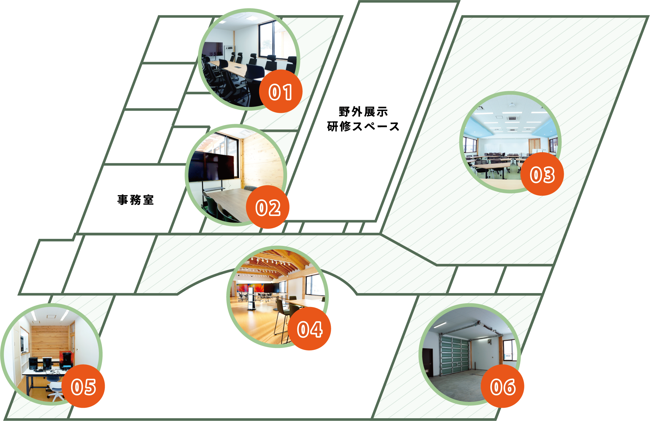 施設には、事務室(21.20㎡)、ミーティングルーム(10.80㎡)×2、会議室(23.76㎡)、サーバー室(8.64㎡)、電子工作室(25.92㎡)、分析検査スペース(25.92㎡)、展示スペース(116.67㎡)、教育研修室(152.28㎡)、農機具メンテナンススペース兼物置(51.19㎡)、屋外展示・研修スペース(90.72㎡)があります。