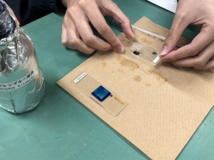 リンゴ発芽日調査を行いました 2021年4月13日 最終更新日時 : 2021年4月14日 Members あいにくの天気の中、3年生と果樹グループの4年生で、リンゴの発芽日調査を行いました。これから当番制で週2回、発芽日調査と、リンゴ黒星病菌の子のう胞子採取トラップの交換を行っていきます。右の写真は採取した子のう胞子をメチレンブルー溶液で固定しているところです。