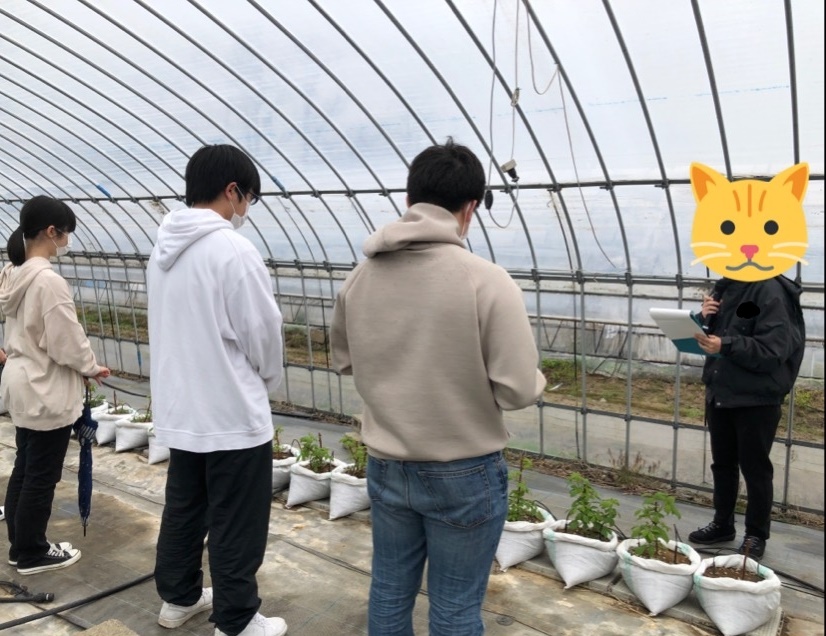 花苗などを栽培している温室の説明を花のAくん、イチゴのハウスの説明を野菜のSさん、キイチゴのハウスの説明を果樹のキイチゴ見習いSさんが行いました。私は卒業研究とカラムナータイプのリンゴの説明をしました。