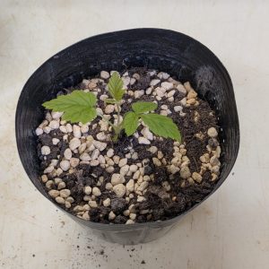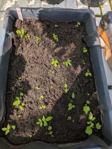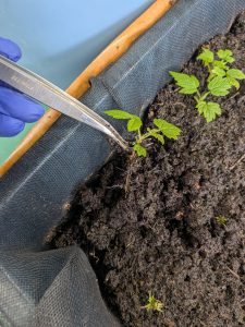 3月2日に3年生に切片をつくって株分けをしてもらった秋季結実性ラズベリー‘ヘリテージ’が発芽し、本葉が複数出てきたため鉢上げを行いました。