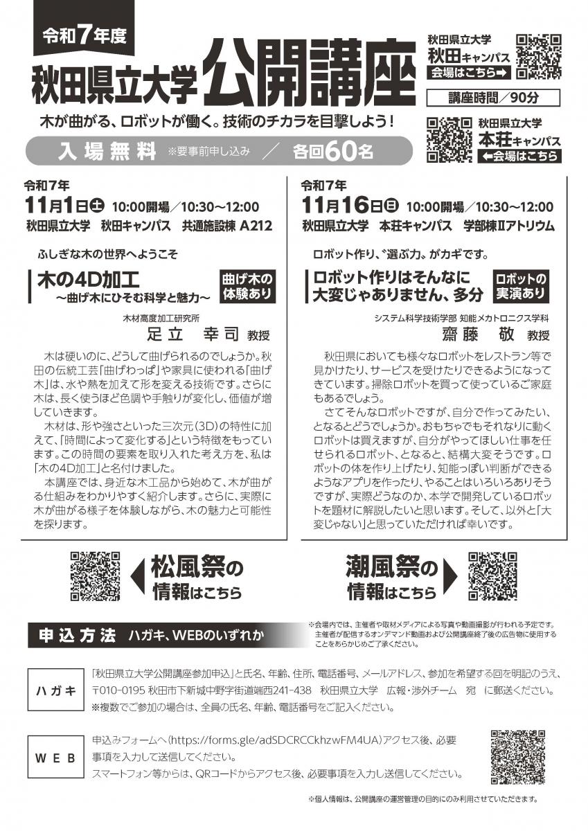 秋田県立大学では、例年、学術研究の成果を広く社会へ公開し、県民に高度な学習機会を提供するとともに、生涯学習の推進に資することを目的として公開講座を開催しています。今回は、曲げ木の体験やロボットの実演など、見て、触って楽しんでいただける内容となっております。また、松風祭、潮風祭と同時開催となっておりますので、皆さんお誘い合わせのうえ、ぜひお越しください!皆様のご来場をお待ちしています!