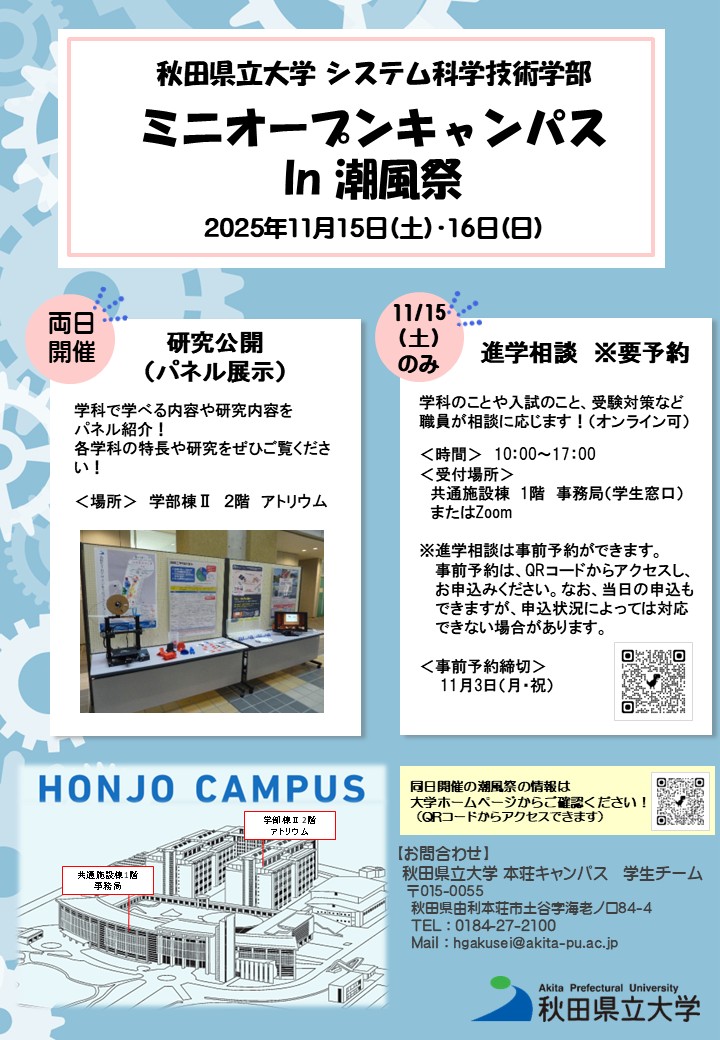 ◆日時:令和7年11月15日(土)・16日(日)◆場所:本荘キャンパス (〒015-0055 秋田県由利本荘市土谷字海老ノ口84-4)