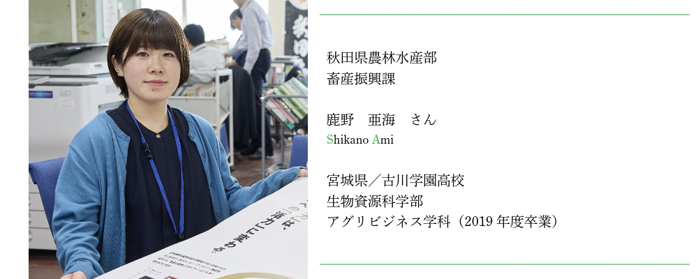 私はアグリビジネス学科で家畜資源利用推進プロジェクトを選択し、日本短角種を通じた耕畜連携など、畜産について学びました。家畜資源利用推進プロジェクトでは座学や実験だけでなく、実習で短角牛に触れることができたため、畜産の理解を深めることができました。そこで畜産に魅力を感じ、就職活動をする際も学んだ知識を生かした仕事をしたいと思い、令和2年4月に入庁し、畜産試験場比内地鶏研究部に配属されました。そこでは、比内地鶏の親鳥の維持・管理や比内地鶏に関する試験研究に5年間従事し、現在は本庁の畜産振興課に在籍しています。今後も秋田県の農家さんや関係事業者を支援しながら、1人でも多くの消費者が秋田県の畜産物を食べ、その魅力が届くよう尽力していきたいと思います。