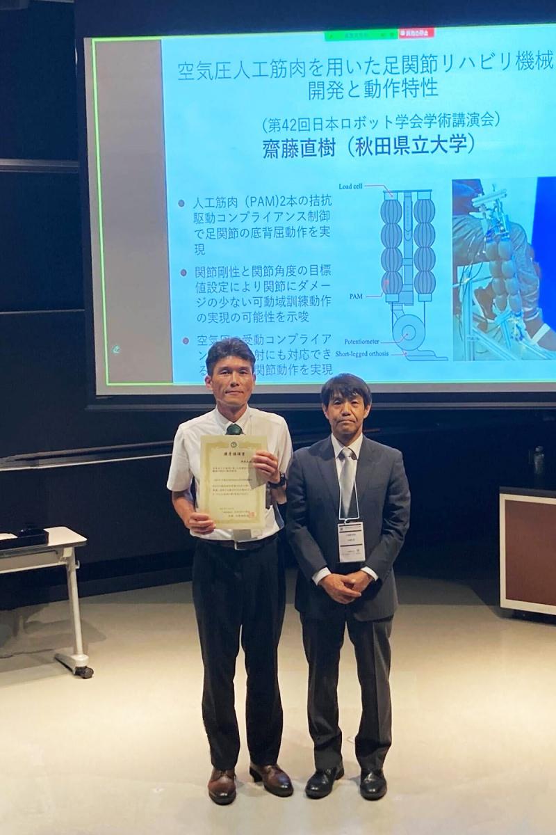 本賞は、日本ロボット学会学術講演会にて、全登壇者(発表件数806件)の中から、ロボット学の発展に貢献する優秀な発表と認められたものに対して贈られるもので、昨年発表した足関節リハビリシステムに関する研究「空気圧人工筋肉を用いた足関節リハビリ機械の開発と動作特性」が評価されました。