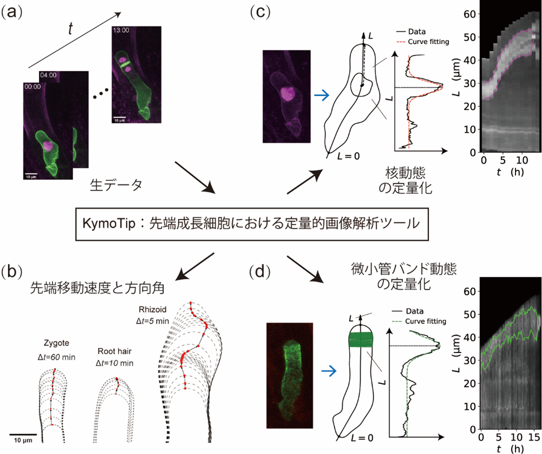 図1:KymoTipによる先端成長細胞の定量的画像解析の概要