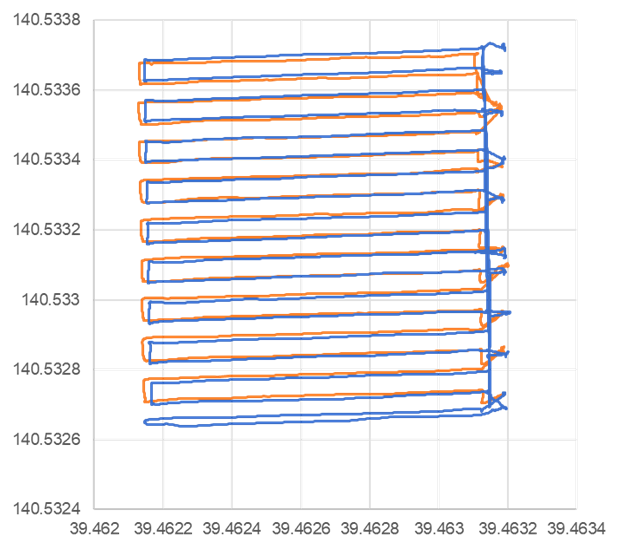 ・青色線:復路の飛行軌跡 ・赤色線:往路の飛行航路 ※圃場を往復して、二度撒き散布