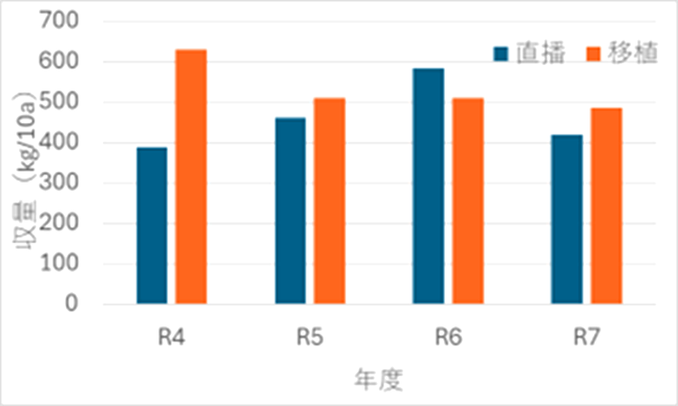 ・4年間平均では移植栽培比で若干減収・新型粒剤散布装置と高精度自動飛行を導入した直近3年間では