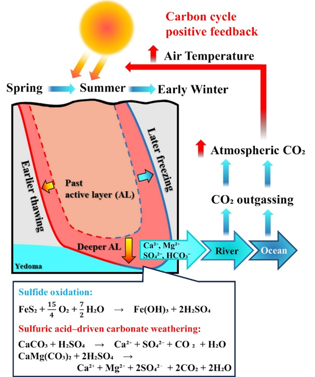 | 〇北極圏は世界で最も温暖化が著しい地域です。温暖化に伴う永久凍土の融解は、これまで凍結していた土壌鉱物類の露出を招き、化学的風化作用を促進します。その結果、新たに溶け出した風化由来イオン(Ca 2+、Mg 2+、SO 4 2-)が河川へと流出します。本研究では、北東シベリアのコリマ川(流域面積は日本の国土の約1.7倍)において、1980年から2022年までの長期的な水質傾向とその変動メカニズムについて解析しました。 〇この川では過去43年間で風化由来イオンの濃度が有意に上昇していました。さらに、これらの濃度上昇は気温と土壌温度の上昇、および活動層(永久凍土の上層に位置し、夏季に融解する土壌層)の深化と密接に関連していました。特に、北東シベリアが記録的熱波に見舞われた2020年には、風化由来イオンの濃度が過去最高値を記録しました。これは、熱波による異常高温が、「エドマ」と呼ばれる含氷率の高い永久凍土の融解を加速させた結果と考えられます。これらの結果は、極端な気温上昇が、風化由来イオンを北極圏の河川に大量流出させる誘因となる可能性を示唆しています。 〇これらの発見は、温暖化が進むなかで北極圏の河川システムがどのように変貌し、さらに河川を介した化学成分輸送が北極海にどのような影響を及ぼすかを理解する上で重要です。したがって、永久凍土融解に伴う環境変化を正確に把握するには、「河川水質」「気候」「永久凍土の状態」を統合的にモニタリングしていくことが不可欠です。 〇今後の展望…近年、北極圏では記録的な熱波が発生しており、今後その頻度と強度は増加すると予測されています。このような異常気象に起因する河川を通じた化学物質の大量放出は、従来の緩やかな温暖化予測の枠組みでは捉えきれない急激な北極海の水質変化を引き起こす可能性があります。今後は、こうした極端現象が北極圏の物質循環に与えるインパクトを精緻に予測し、北極圏の河川システム変貌の全容解明を目指します。 |