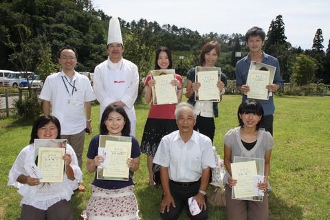 後列左から、中村勝則准教授、菅生春雄さん(秋田市「手作りケーキ グランシェフ」代表) 前列左から 長津瞳さん、築舘亜由美さん、米森萬壽美さん(JA秋田やまもと組合長)、倉島梢さん |