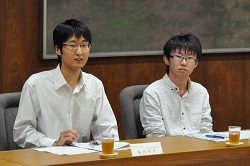 平成27年6月30日(火)に、秋田県議会「地方創生に関する調査特別委員会」による県民との意見交換会が開催され、本学システム科学技術学部の梅内哲也さん(電子情報システム学科3年)と生物資源科学部の菅原巧太朗さん(生物環境科学科3年)が参加しました。これは、同委員会が、若者の県内定住を促す方策について、県内各国公立大学から参加した6名の学生と意見交換するために開催したものです。