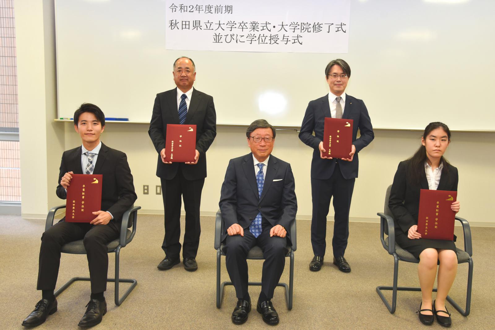 9月25日、秋田キャンパスにおいて令和2年度前期秋田県立大学卒業式・大学院修了式並びに学位授与式が執り行われ、学部生2名、大学院生1名が卒業・修了し、また1名に博士の学位が授与されました。