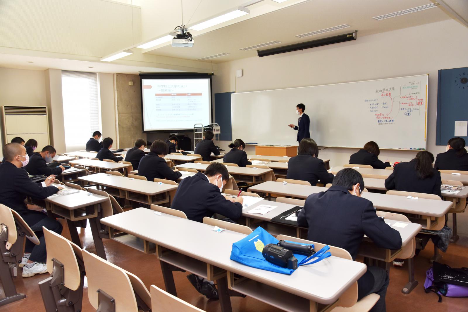 11月20日、大仙市立西仙北中学校2年生17名が秋田キャンパスを訪問しました。今回は、西仙北中学校の「総合的な学習の時間」の一環として、大学を知り進路選択や今後の目指すべき将来について考えを深めることを目的に実施されました。大学の概要説明では、中学・高校と大学の講義や学びの違い、本学の2つの学部の内容や学生生活などについて聞いていただきました。