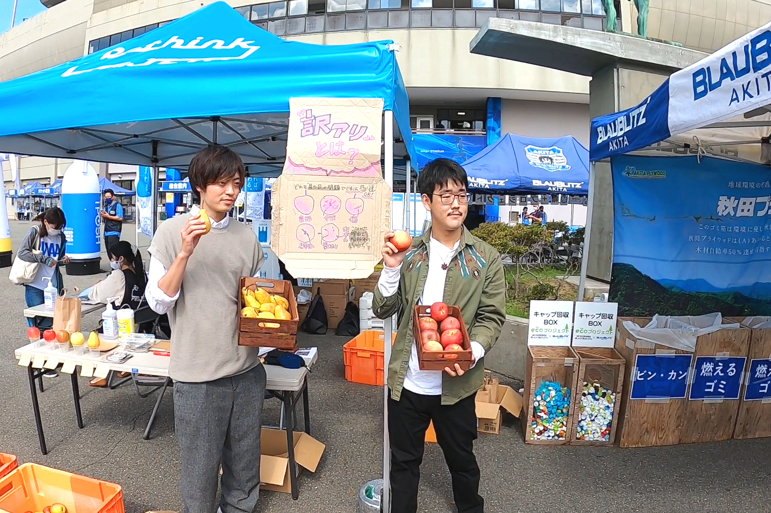 生物資源科学部生物生産科学科3年の伊東 幸親さんは、10月2日(土)、ブラウブリッツ秋田のホームゲーム(inソユースタジアム、VS愛媛FC)のイベントにおいて、傷が付いていたり、サイズや形に難があったりして、食べることができるのに廃棄される“規格外の果物”を格安で販売し果物の魅力を伝えました。販売した果物は、伊東さんが横手市の農家さんから譲り受けた規格外の洋梨やリンゴで、1個100円で販売しました。また、この日は、伊東さんの熱い想いに賛同した、応用生物科学科2年の種市 憲伸さんも一緒に活動しました。