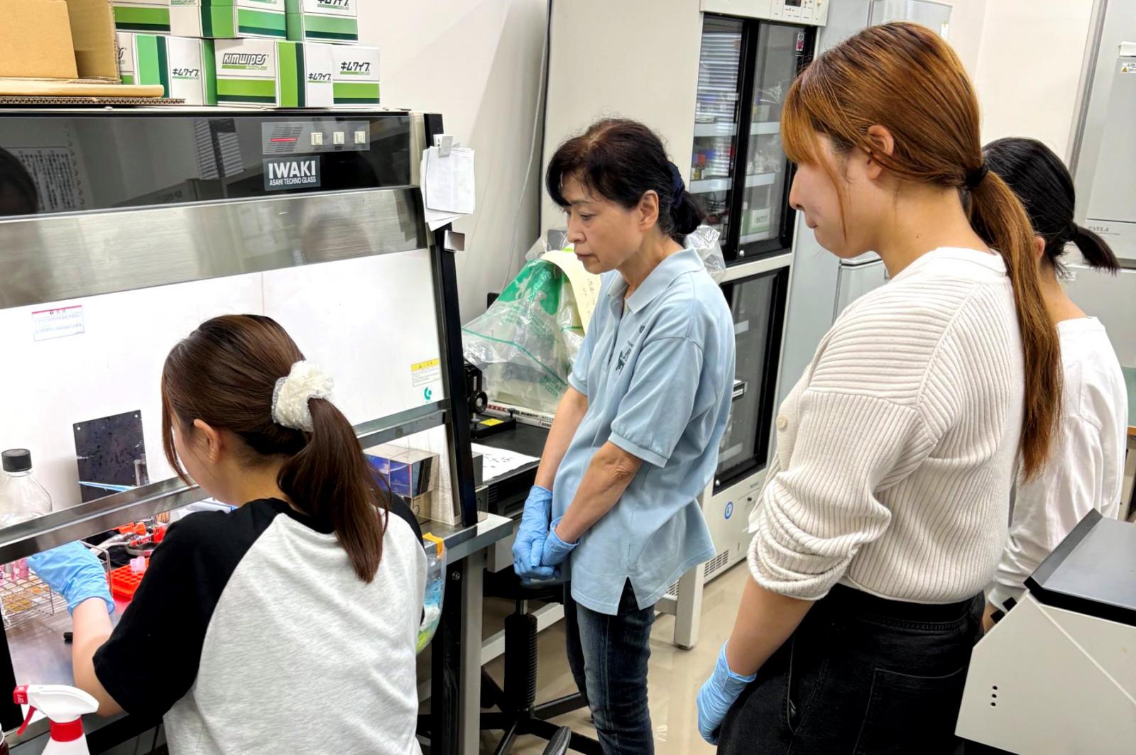 シニア大学生の佐々木裕子さん(69歳)は応用生物科学科1年生の学生自主研究グループ「Rice&Bread ライスアンドブレッド」の学生と一緒に、製パン適性の高い野生酵母を用いた米粉パン作りに向け準備を進めています。