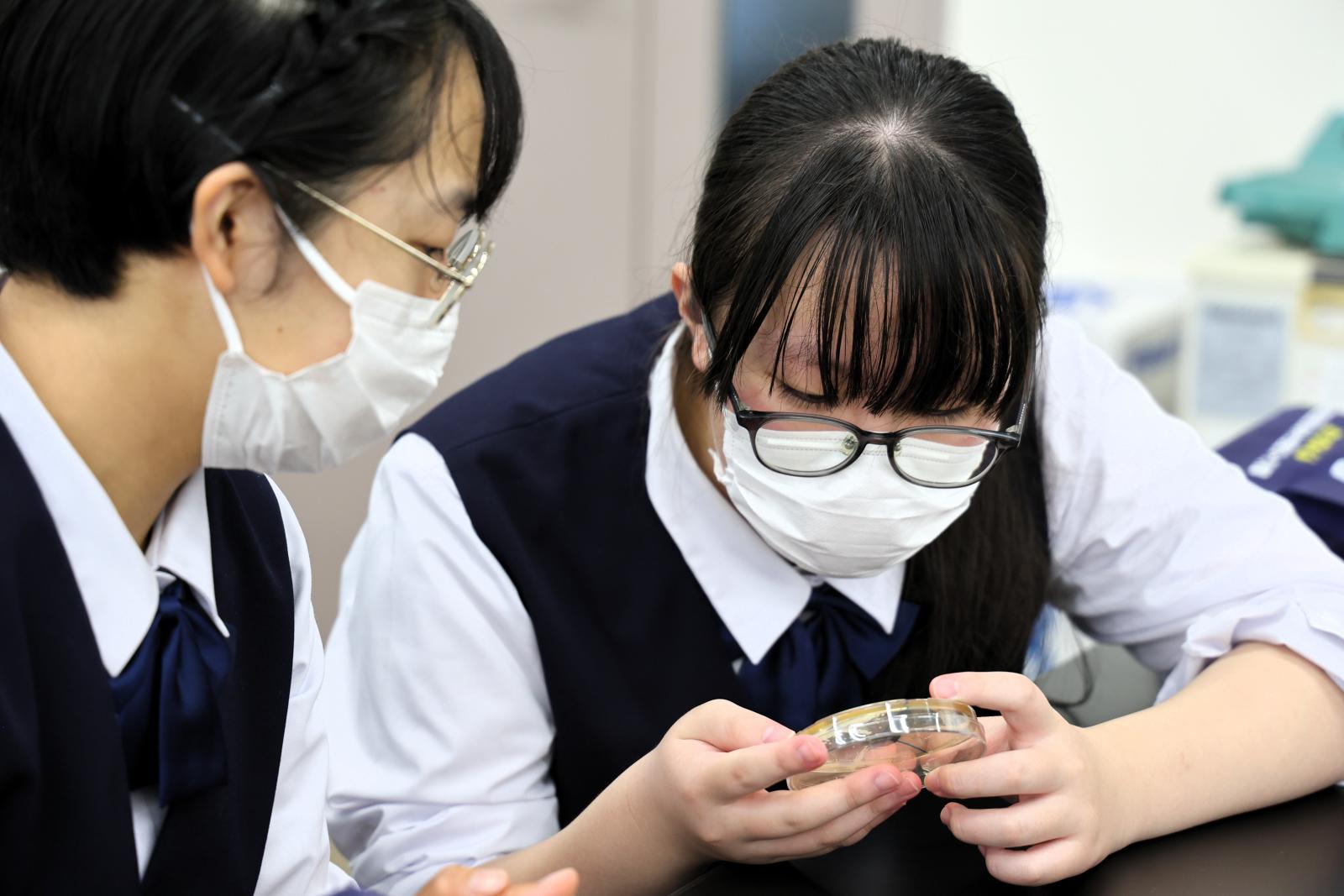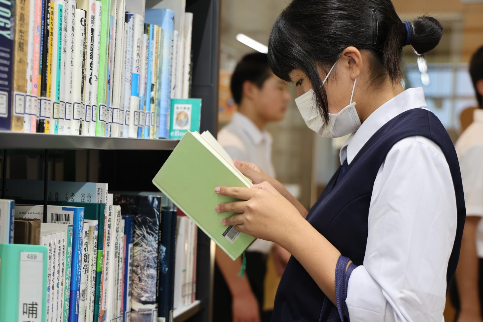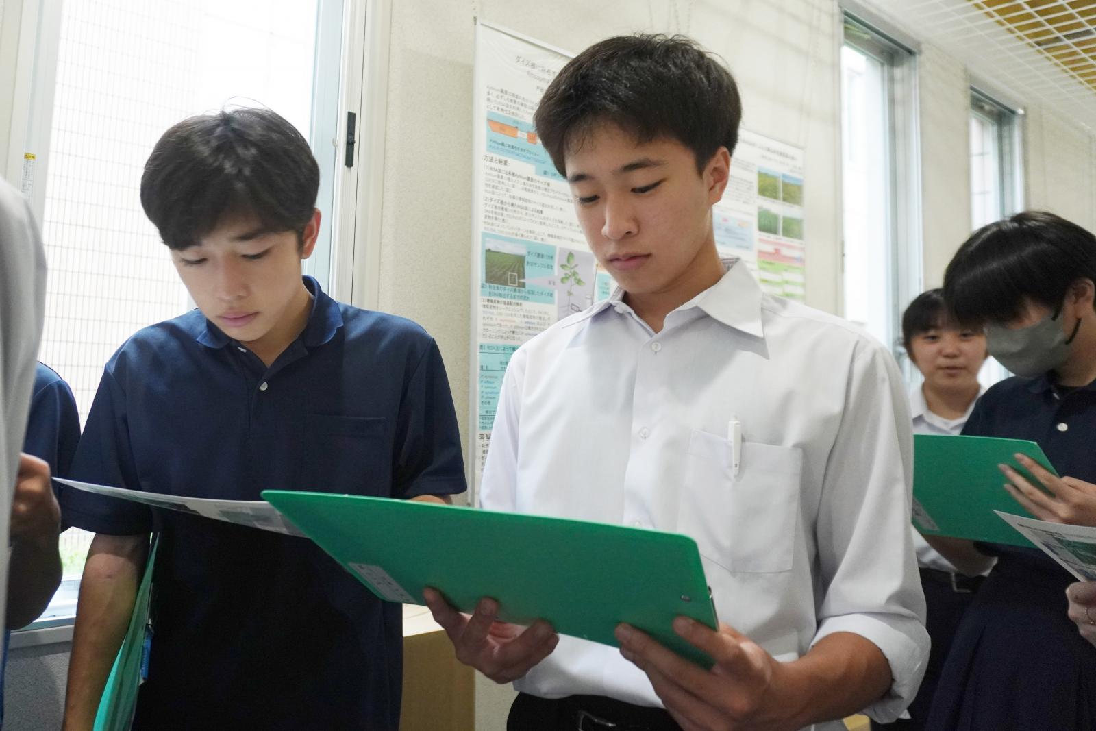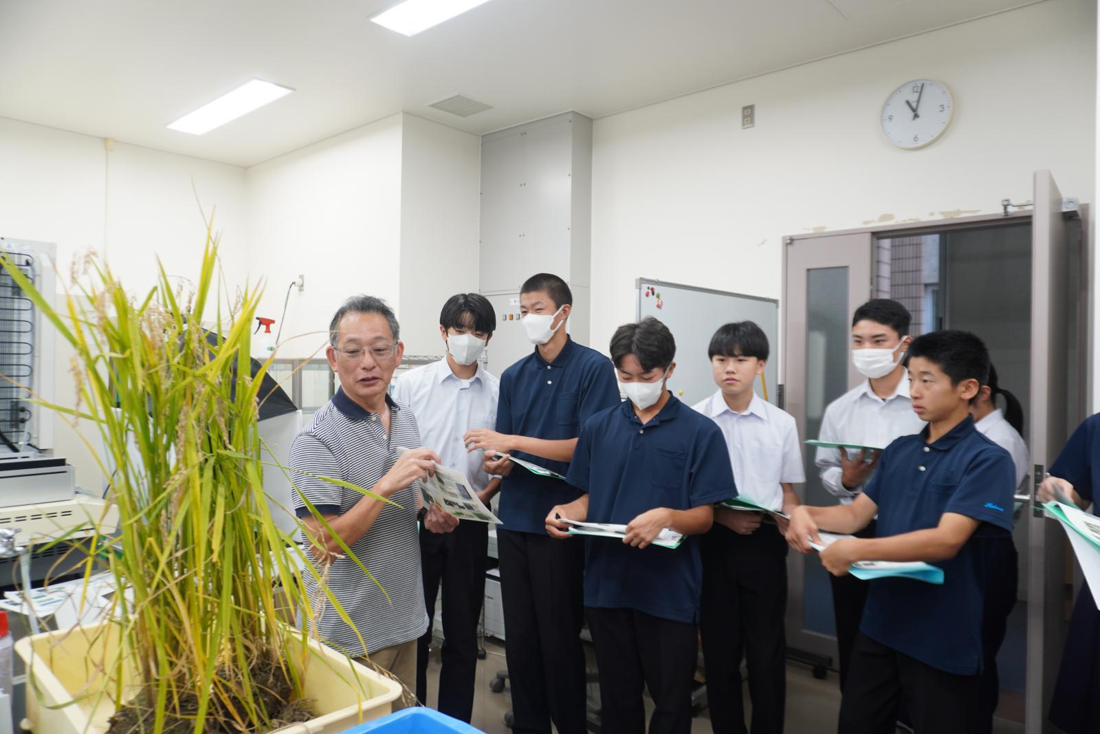 図書館をはじめとしたさまざまな施設を見学しました。生物実験室を訪問した際には、生物生産科学科の藤 晋一 教授[専門:植物病理学]から、稲をはじめとする植物の病害について学びました。研究室では、実際に生育している稲を見学したほか、農薬を使わない消毒方法についての説明も受けました。「植物のお医者さん」として研究に取り組む藤教授の熱意ある話に、生徒たちは真剣に耳を傾けていました。普段食べているお米や野菜がどのように作られているのか、その背景に病害研究が重要な役割を果たしていることを知り、身近な産業である農業への関心や理解を深める貴重な機会となったようです。