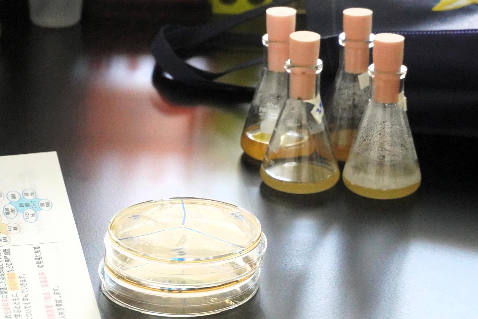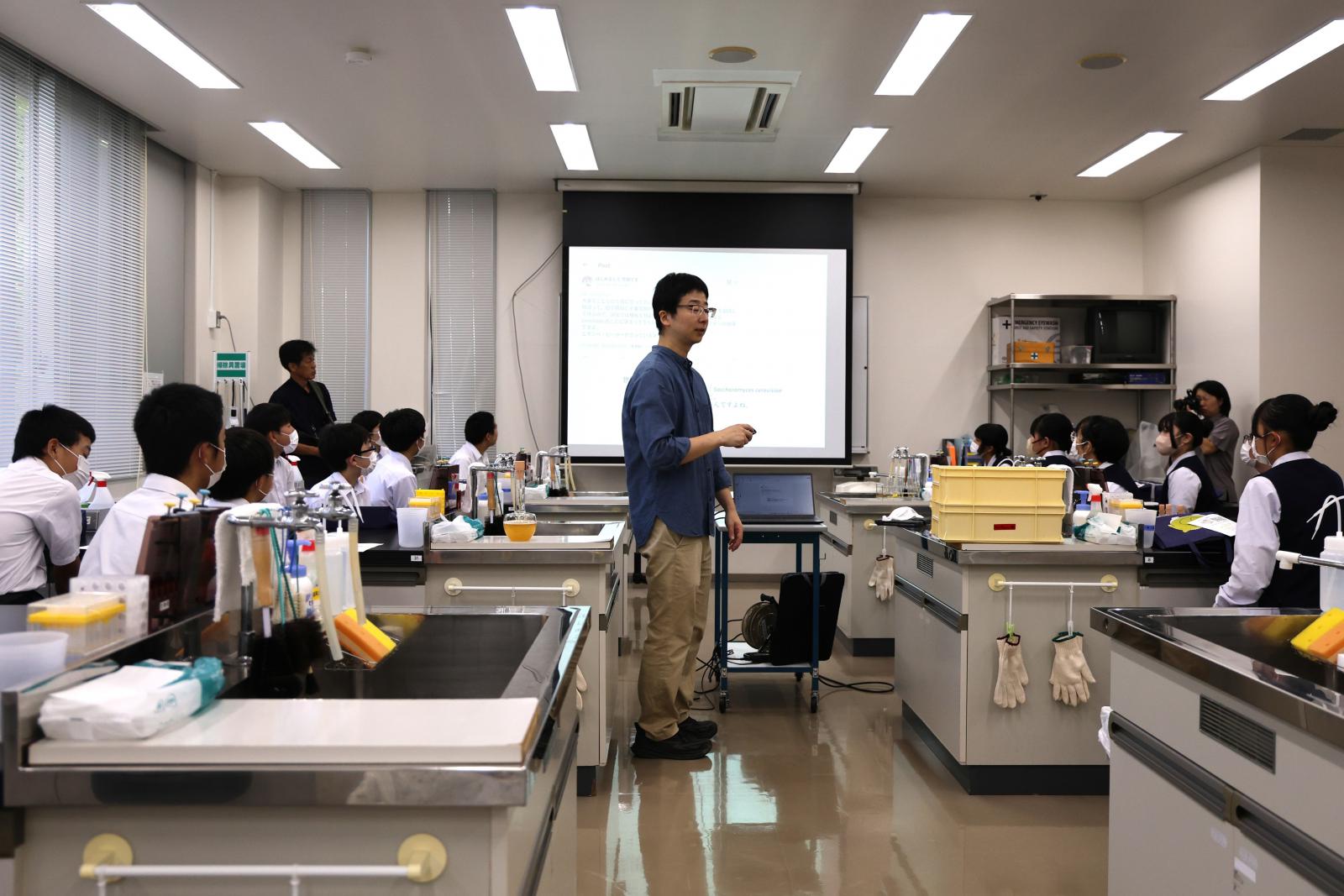 応用生物科学科の吉川 雄樹 助教[専門:醸造微生物学]による模擬講義『誤解だらけの酵母についてあれこれ考えよう』を受講しました。講義では、酵母がいつ誕生したか、どんな特徴があるかといった基礎的な内容に加え、これまで単離した酵母の見た目や香りの違いを実際に比較しながら体感できる内容も盛り込まれました。普段の学校生活ではあまり聞きなれない専門的な話題でしたが、酵母がパンやお酒などに関わる身近な存在であることを知るにつれて、中学生は次第に興味を深め、熱心に耳を傾ける様子が見られました。楽しみながら、微生物研究への理解を深める貴重な時間となりました。施設見学