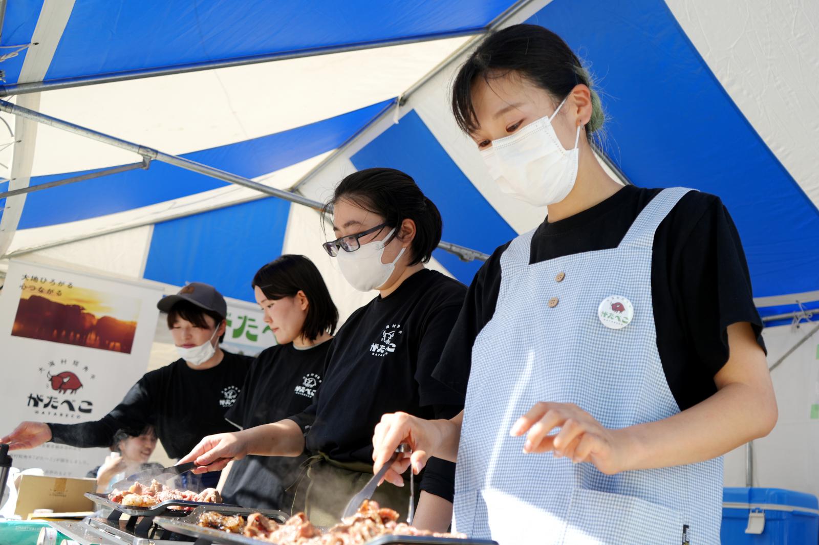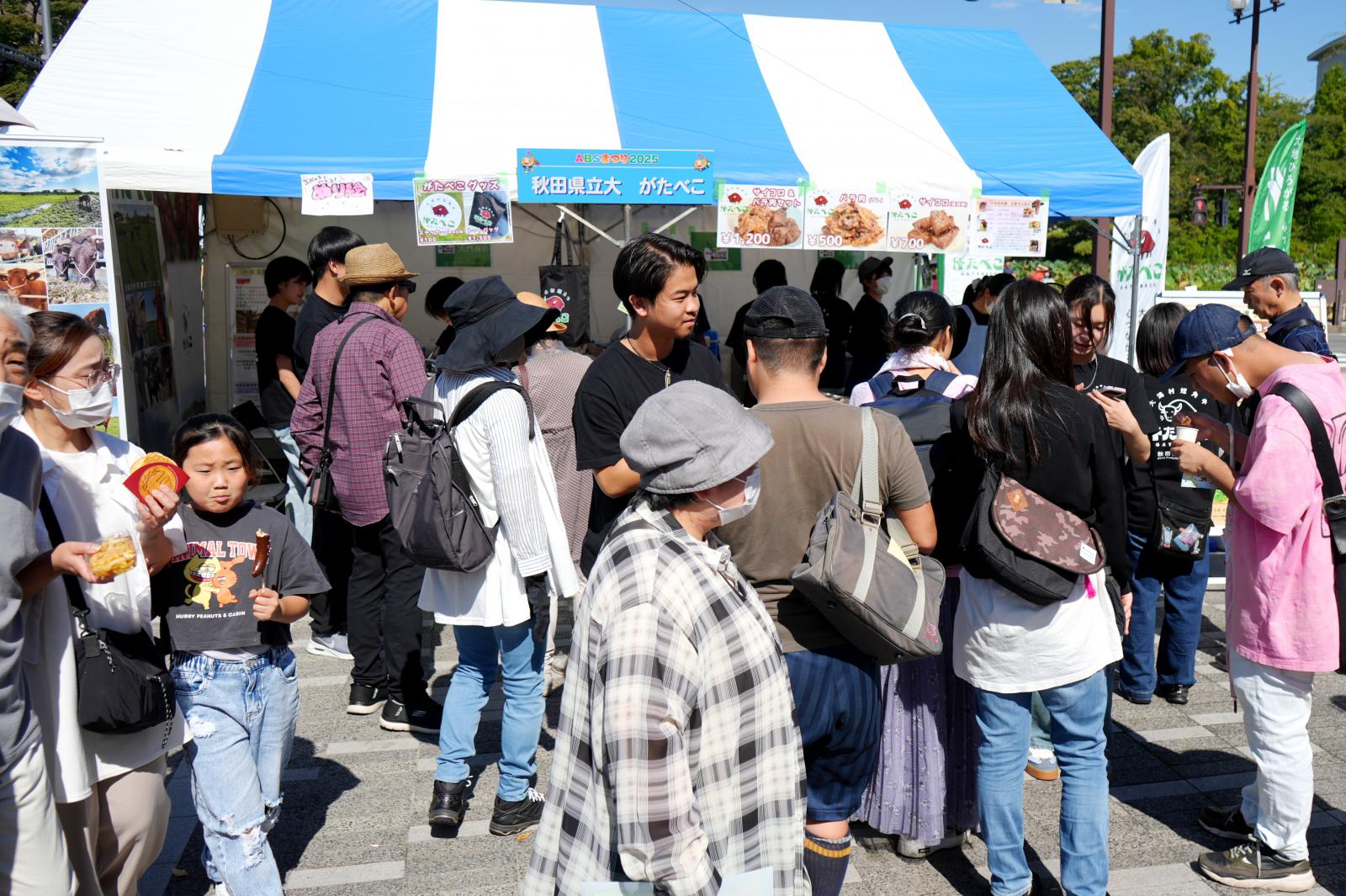 10月4日(土)~5日(日)、秋田市のエリアなかいち特設会場で「ABSまつり2025」が開催され、秋田県立大学短角牛ブランド「がたべこ」を初出展しました。当日は、学生が愛情を込めて育てた「がたべこ」のサイコロステーキとばら肉の焼肉販売を行いました。両日とも開場と同時に長蛇の列ができ、途切れることなく大変な賑わいとなりました。多くの方々に、低脂肪・高たんぱく・ヘルシーで栄養価が高い「がたべこ」の美味しさを存分に味わっていただくことができました。