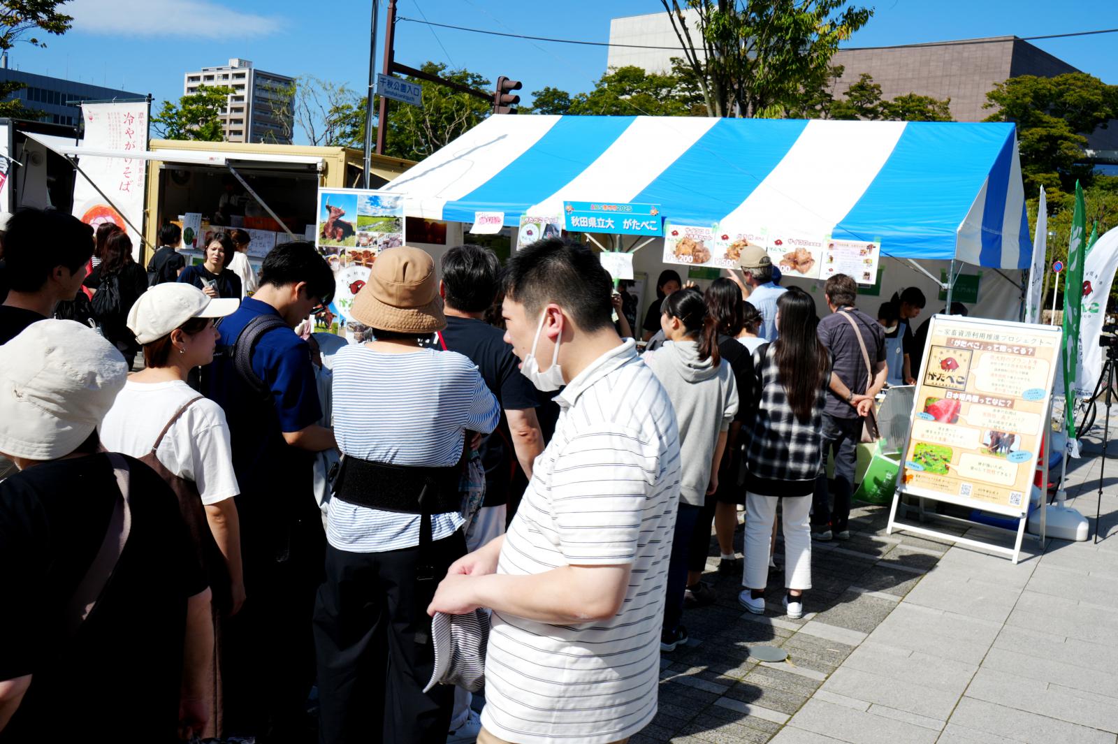 「がたべこ」 は、アグリビジネス学科/家畜資源利用推進プロジェクトが確立した資源循環型飼養技術と国産飼料100%で育てられています。学生の愛情たっぷりに飼養された「がたべこ」の最大の魅力は、低脂肪・高タンパクでヘルシーな赤身肉であることです。放牧による健全な肉質は、嚙めば嚙むほど草の清々しい香りと、凝縮された赤身本来の深い旨みが口いっぱいに広がります。健康志向の方にもオススメできる、まさにな秋田の恵みです!販売ブースの様子♪大盛況です!