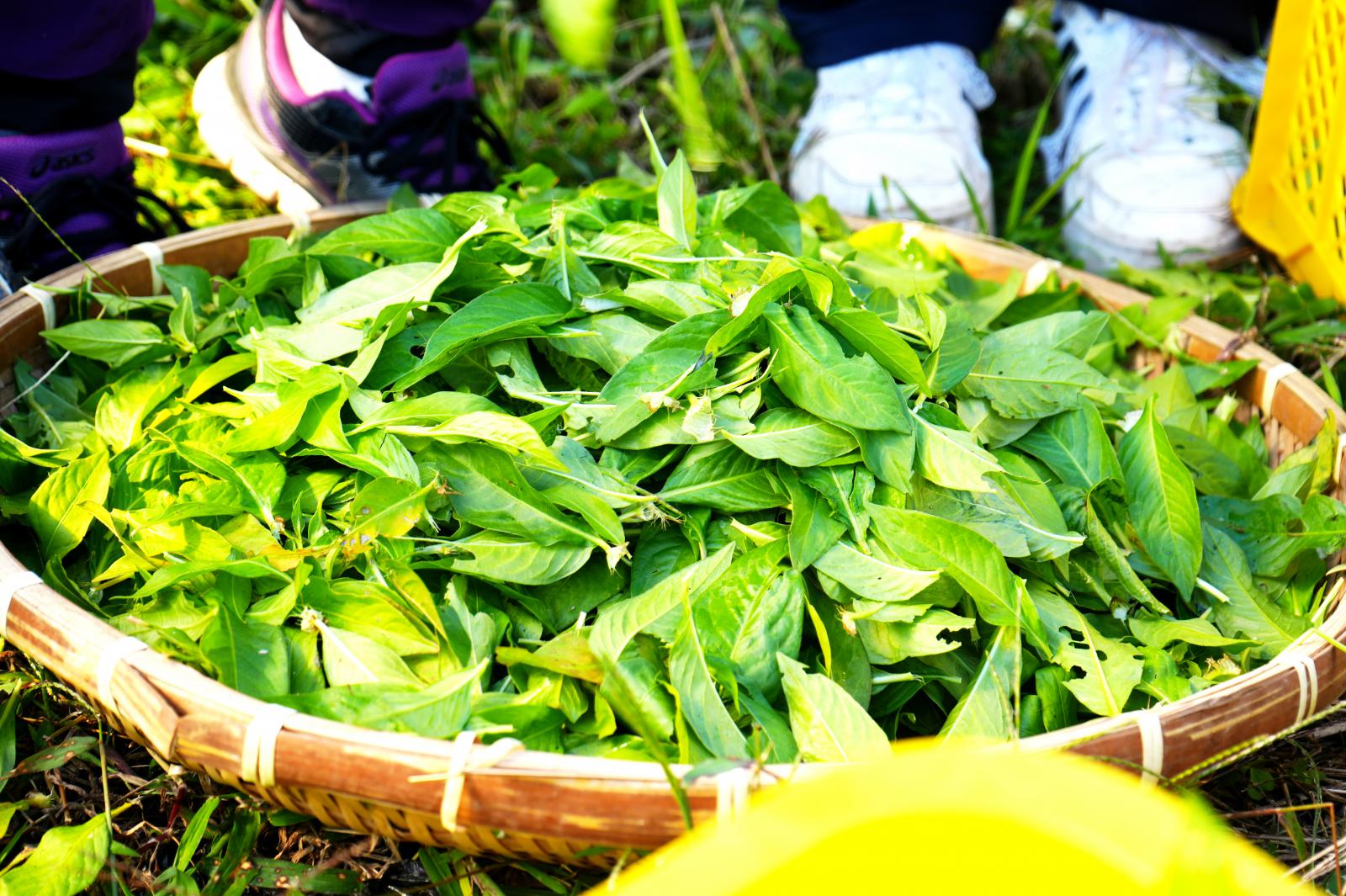 丁寧に葉をもぎ取り葉っぱを選別