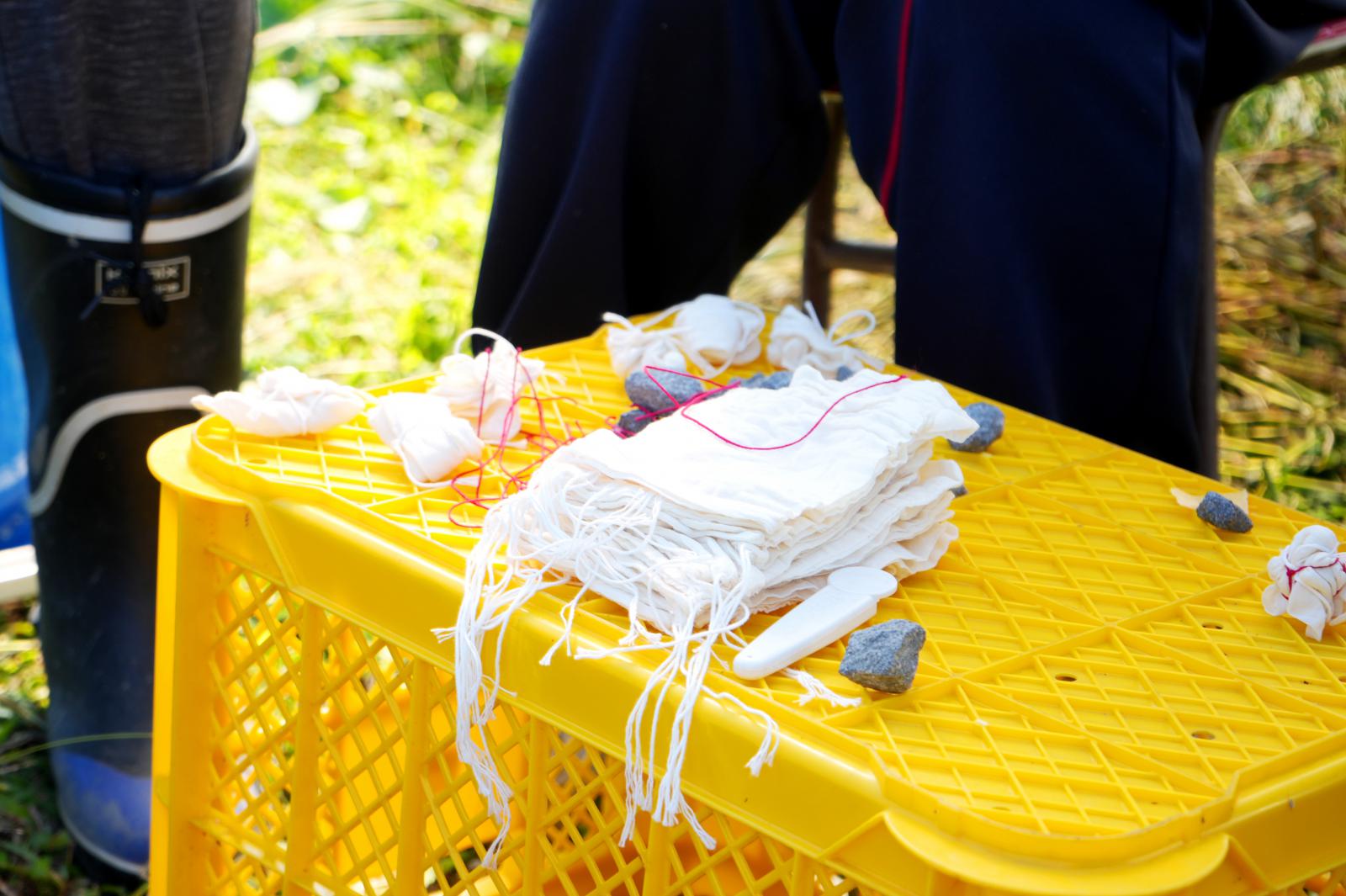 模様がつくように布を糸で縛ったり石を包んだりしました