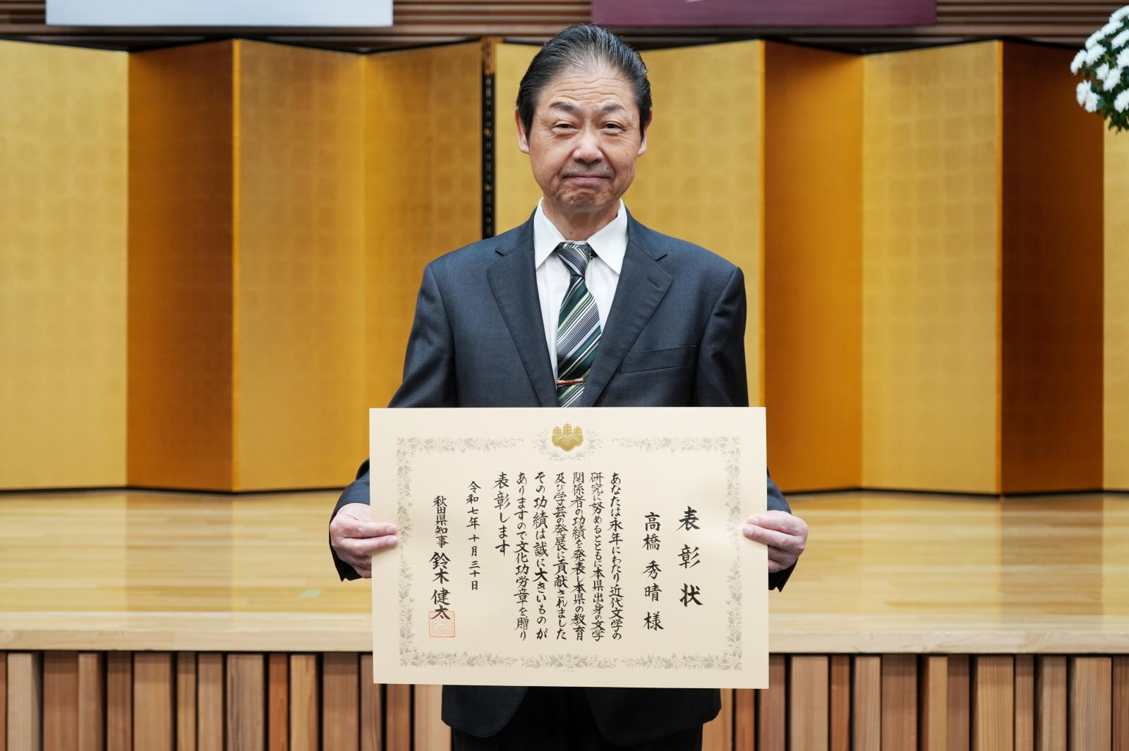 秋田県文化功労者表彰は1956年(昭和31年)に始まり、秋田県の文芸、美術、教育、社会福祉、産業等の分野において、文化向上や発展に功績のある個人・団体を表彰するもので、高橋副学長は、日本近代文学者として、長年の文学研究と評論活動等を通じて本県文化の向上発展ならびに学術研究への卓越した業績が認められ選出されました。