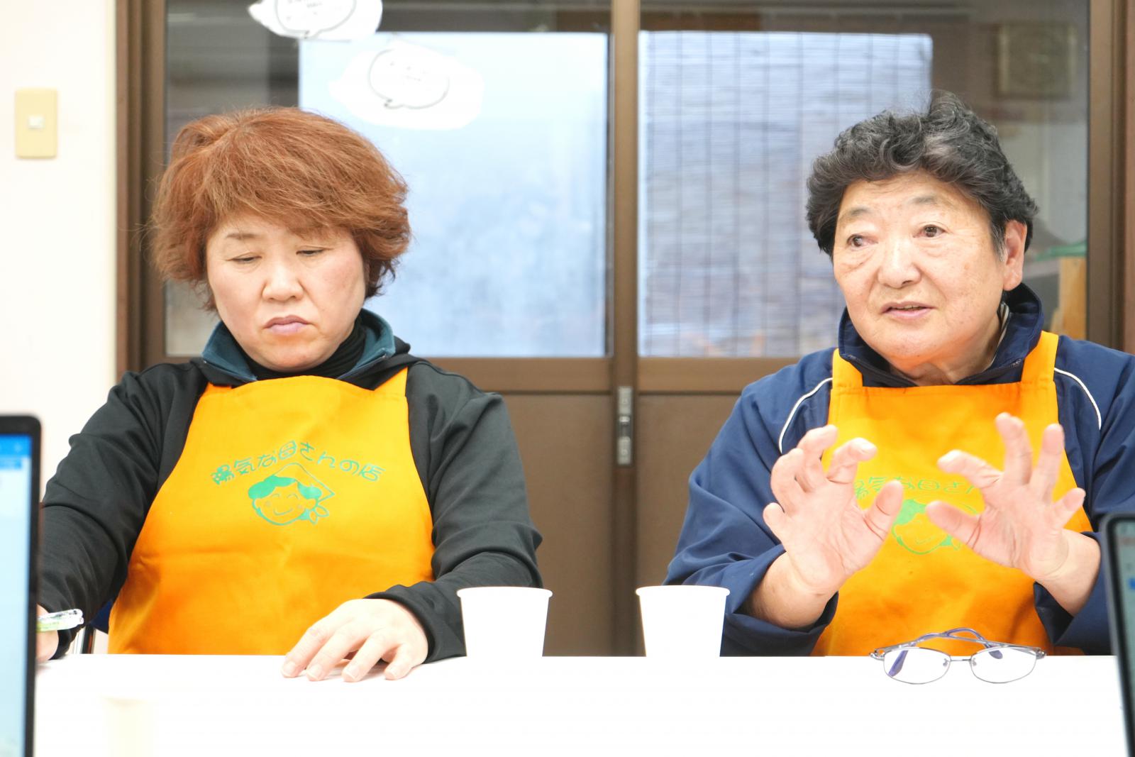 当日は、「陽気な母さんの店」の石垣一子会長と佐々木幹子代表取締役に対し、これまでの調査の状況を説明しました。学生たちは「これまで会員の農家の女性が生きがいや自己実現のために、自宅で加工した漬物を直売所で販売していた。しかし、高齢化により農産物を施設まで一人で運び込むのが難しくなり、食品衛生法改正を機に引退した人が多いのではないか」と分析しました。解決策として、「複数の農家会員で協力することで運搬の課題は解決できる。グループに分けて漬物を漬ける日時を合わせるということも考えられる。」さらに、学生たちからは、漬物加工所に専属の従業員を雇用する提案も出されました。その上で、漬物加工所を効率的に稼働させるためインターネット上でスケジュールを共有し、交代制で利用する仕組みを導入する案や、専従の従業員が直売所ならではの漬物を加工できるように「レシピ集」としてまとめるなどの提案を示しました。