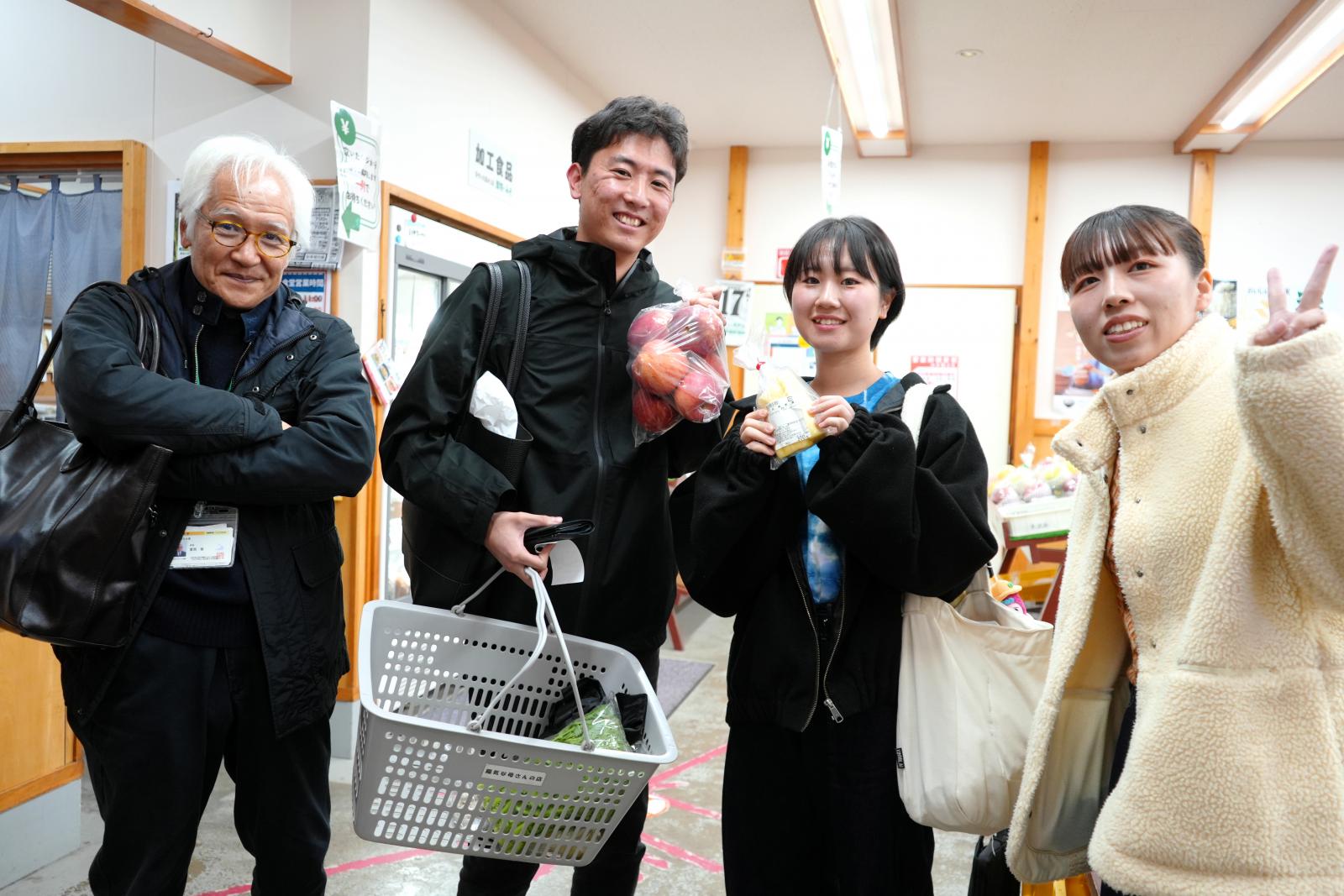 令和7年11月17日、生物資源科学部アグリビジネス学科の学生3人(地域ビジネス革新プロジェクト/指導教員:重岡 徹 教授[農村社会学])が、大館市の農産物直売所「陽気な母さんの店」に出向き、直売所の経営課題の解決に向けて意見交換を行いました。学生はこれまでのヒアリング調査で、販売する漬物が衛生管理された加工施設での製造が義務化された食品衛生法の改正を受けて、新たに整備された漬物加工所の利用率が低迷している実態や、生産者の高齢化や廃業により、農産物が集まりにくく、人手不足により新規事業に挑戦できないなどの現状を把握しており、これらの解決に向けて原因究明と解決策の提案に取り組んでいます。