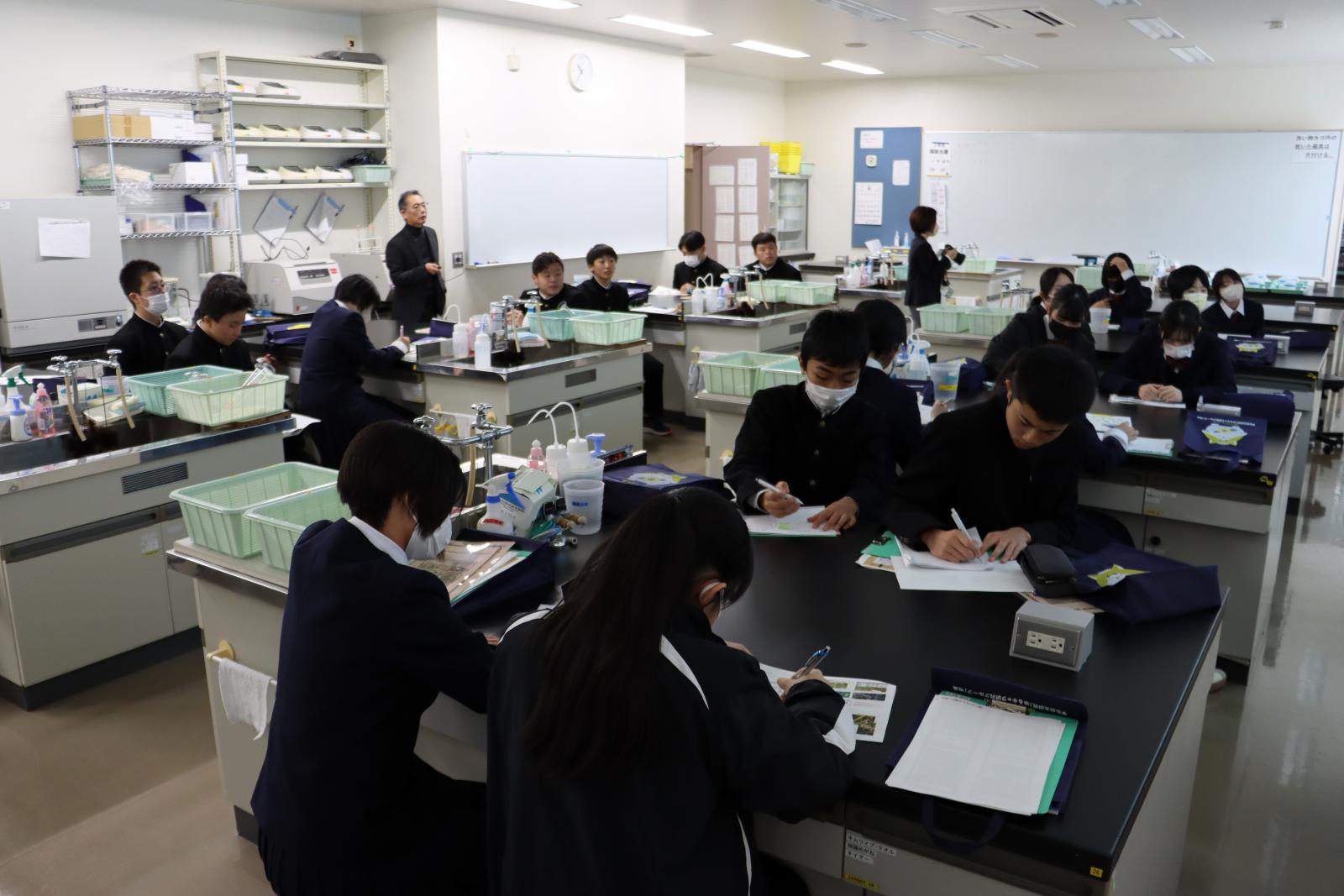 生物生産科学科の藤 晋一教授[専門:植物病理学]による模擬講義『農家を助ける植物のお医者さん』を受講しました。藤教授からは、イネいもち病やウイルス・細菌による植物の病気など、植物の病原菌に関する研究について説明がありました。中学の授業で習う内容に触れながら、農作物の病害が引き起こした飢饉について学び、植物が病気になる原因・背景について考えました。中学生は、藤教授からの問いかけに元気よく反応し、熱心にメモをとる様子が見られました。楽しみながら、植物の生態への理解を深める貴重な時間となりました。施設見学