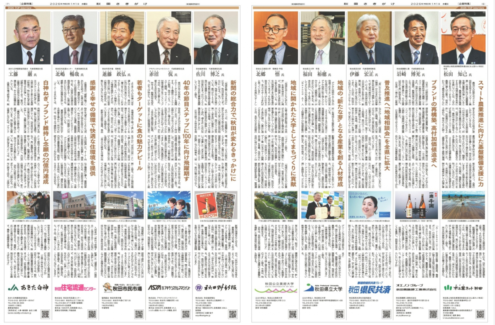 秋田魁新報社「2026新春トップインタビュー」に福田学長のインタビュー記事が掲載されました 2026年1月1日付けの、秋田魁新報社「トップインタビュー2026」において、福田 裕穂 学長のインタビュー記事が掲載されました。 本学は、地域に貢献する「開かれた大学」として地域課題に真摯に向き合い、教職員一丸となって、持続可能な地域社会の発展に努めてまいる所存です。本年もどうぞよろしくお願いいたします。 [PDF]クリックで福田学長のインタビュー記事をご覧いただけます