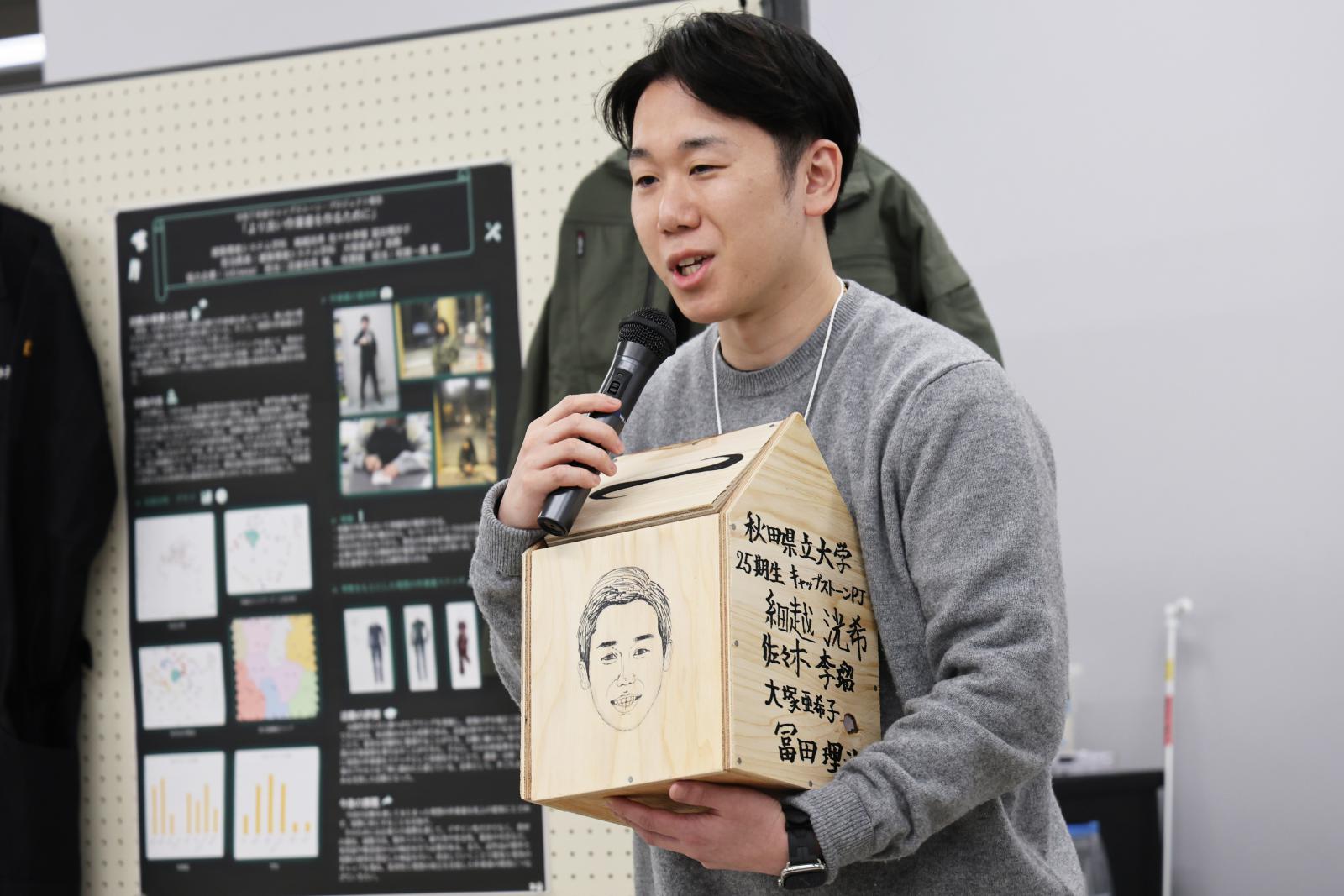 「キャップストーンプロジェクト」は、本学が令和5年9月に策定した「秋田県立大学ビジョン2033」にもとづき、自治体、企業、法人等が現場で直面している課題や実社会における諸問題を学生が企業との連携により解決策を導き出す実践型演習科目です。本取組は、令和6年度後期授業よりシステム科学技術学部の3学科で先行的に開始され、令和7年度後期授業からは、同学部の5学科および生物資源科学部アグリビジネス学科において実施されています。今年度が初めての実施となる建築環境システム学科では、当該科目を履修する学生21名が6グループに分かれて取り組みました。