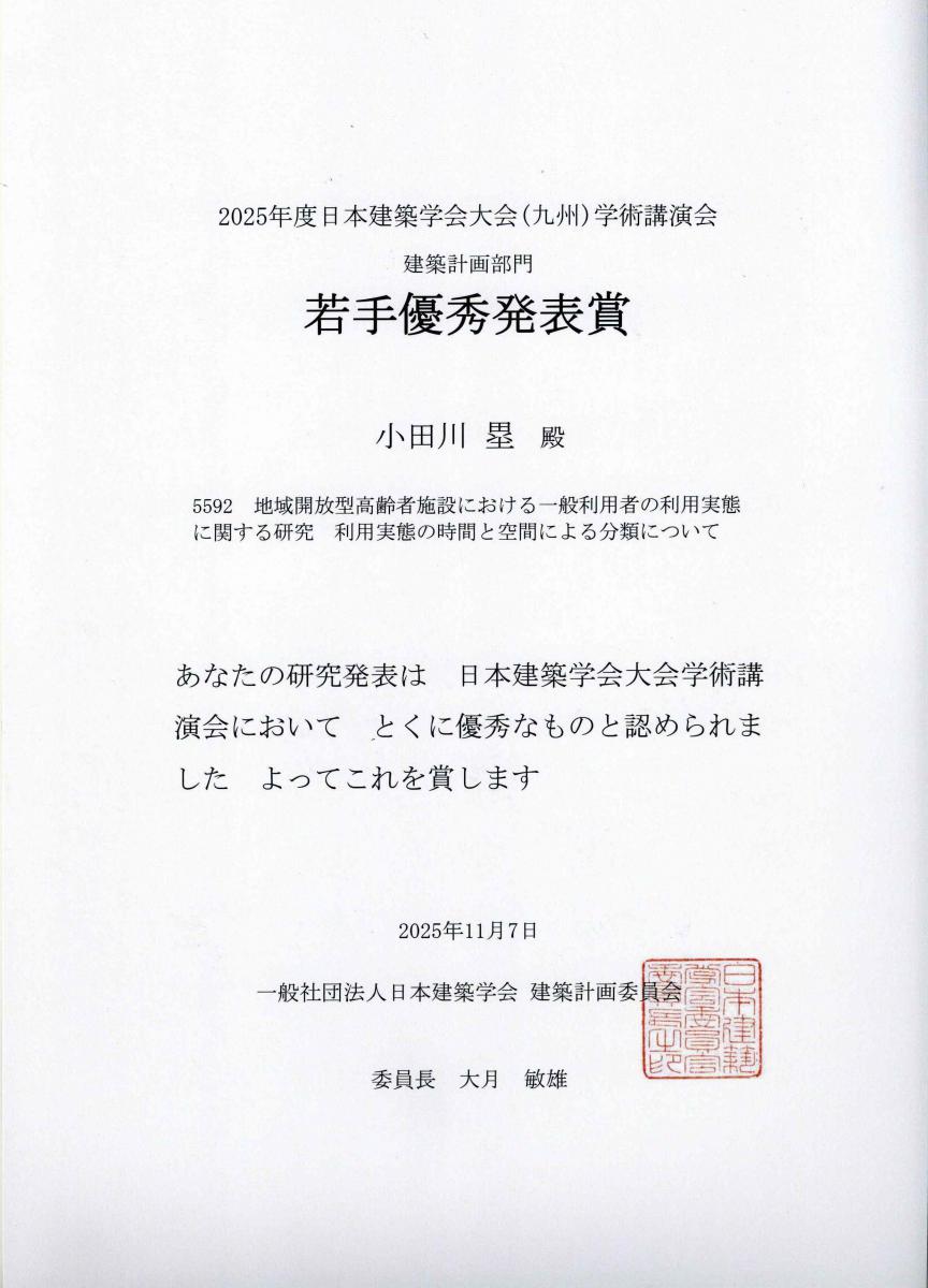 現在、システム科学技術研究科 総合システム工学専攻 都市・建築計画学研究グループに所属している大学院生・小田川塁さんの発表論文「地域開放型高齢者施設における一般利用者の利用実態に関する研究-利用実態の時間と空間による分類について-」が、2025年日本建築学会大会(九州)学術講演会の若手優秀発表賞を受賞しました。