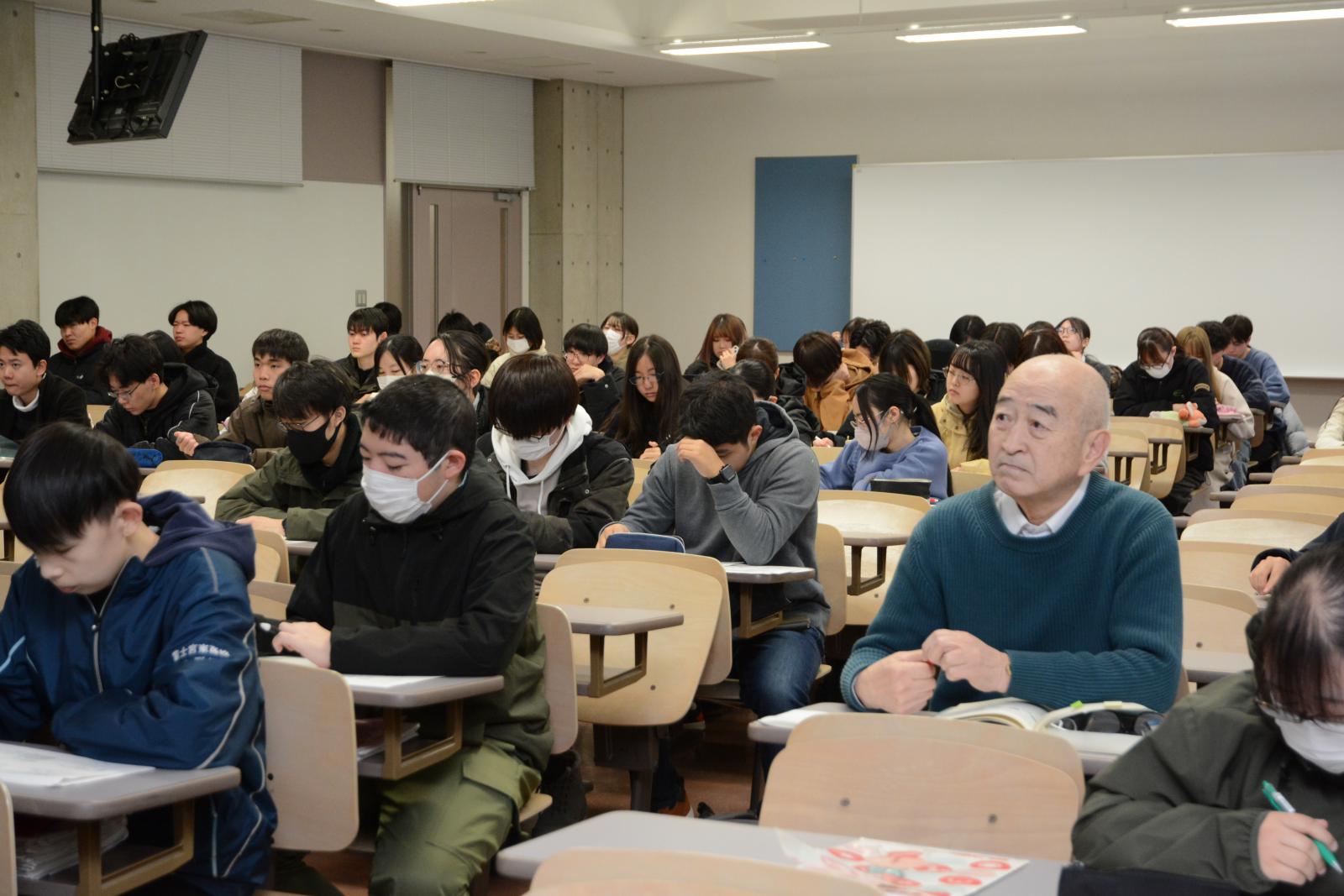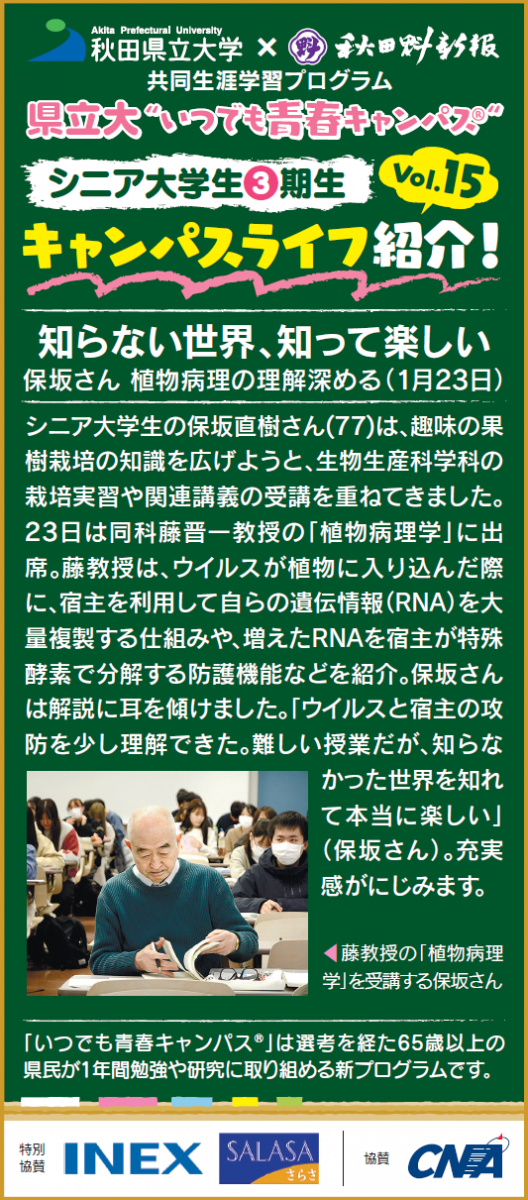 シニア大学生の保坂直樹さん(77歳)は、長年、趣味で作物や果樹の栽培を楽しんできましたが、「なぜ病気になるのか、その根本を知りたい。知識をもっと身につけたい」という思いから、生物生産科学科の栽培実習や関連講義を熱心に受講しています。1月23日には、生物生産科学科の藤晋一教授の講義「植物病理学」を受講しました。この日は、目に見えないウイルスの増殖メカニズムと、それに対抗する植物の生命力をテーマに講義が行われました。