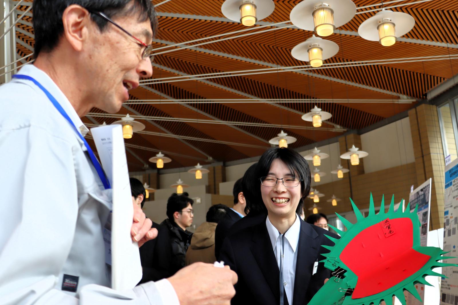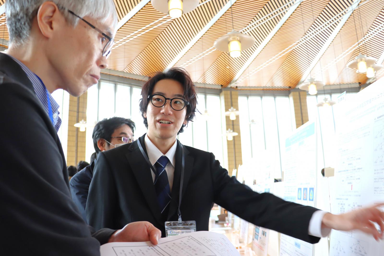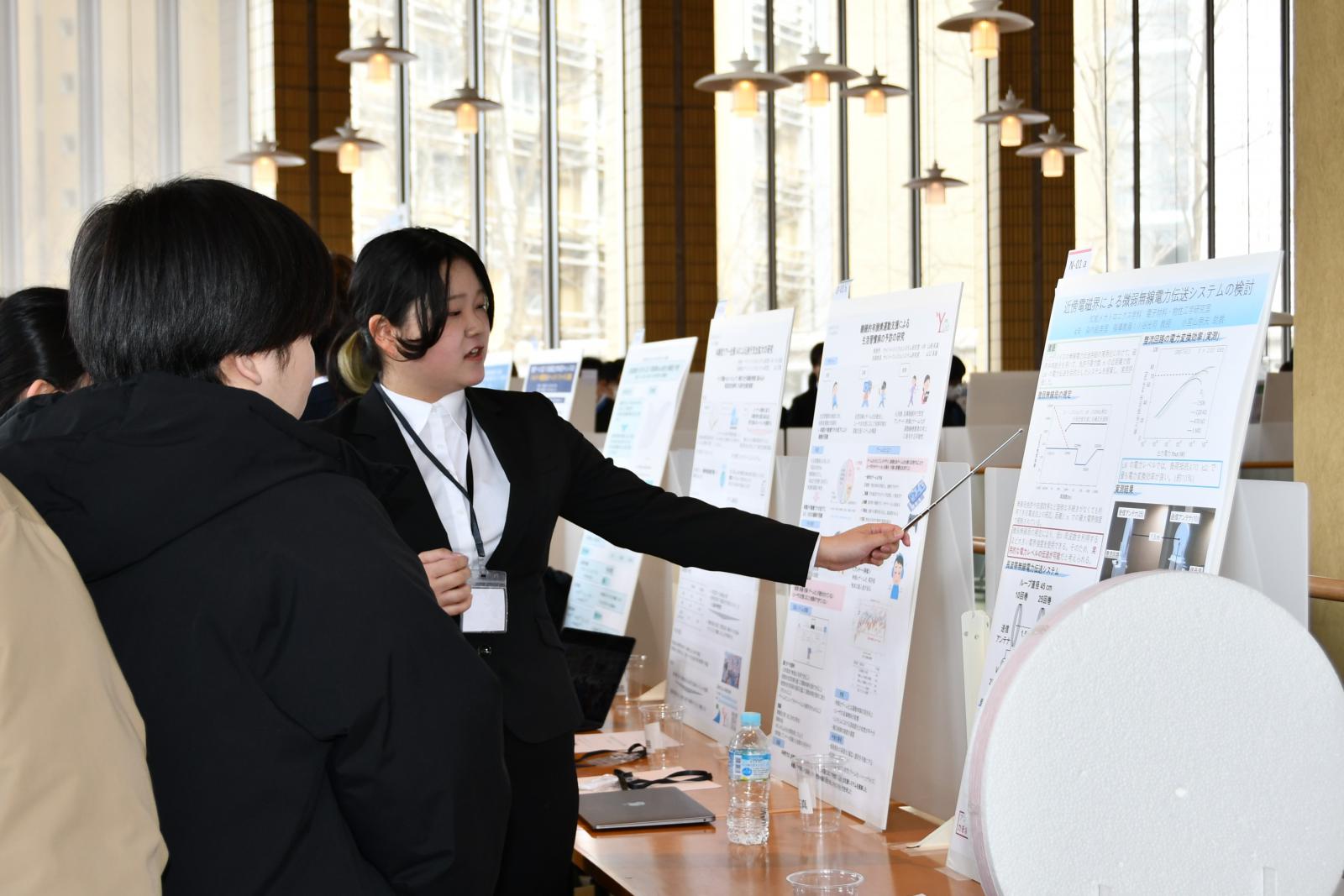 当日は、システム科学技術学部4年生、システム科学技術研究科の学生が、来場した企業技術者など学外の方に向け、卒業研究をはじめとする最新の研究成果をポスター形式でプレゼン発表しました。発表は2グループに分かれ、1時間ごとのコアタイムを設けて発表を行い、広範な業種分野の技術者の皆さんと活発にディスカッションしました。参加した学生からは、「自分の研究分野と異なる分野の企業の方からアドバイスをいただき、新たな気づきを得ることができた」「予想外の質問に戸惑うこともあったが、4年間で培った知識をもとに答えることができた」といった声が寄せられました。学生にとっては、自身の研究を社会にどう役立てるかという視点を再確認する機会となり、研究意欲の向上や新たな課題の発見にも繋がりました。