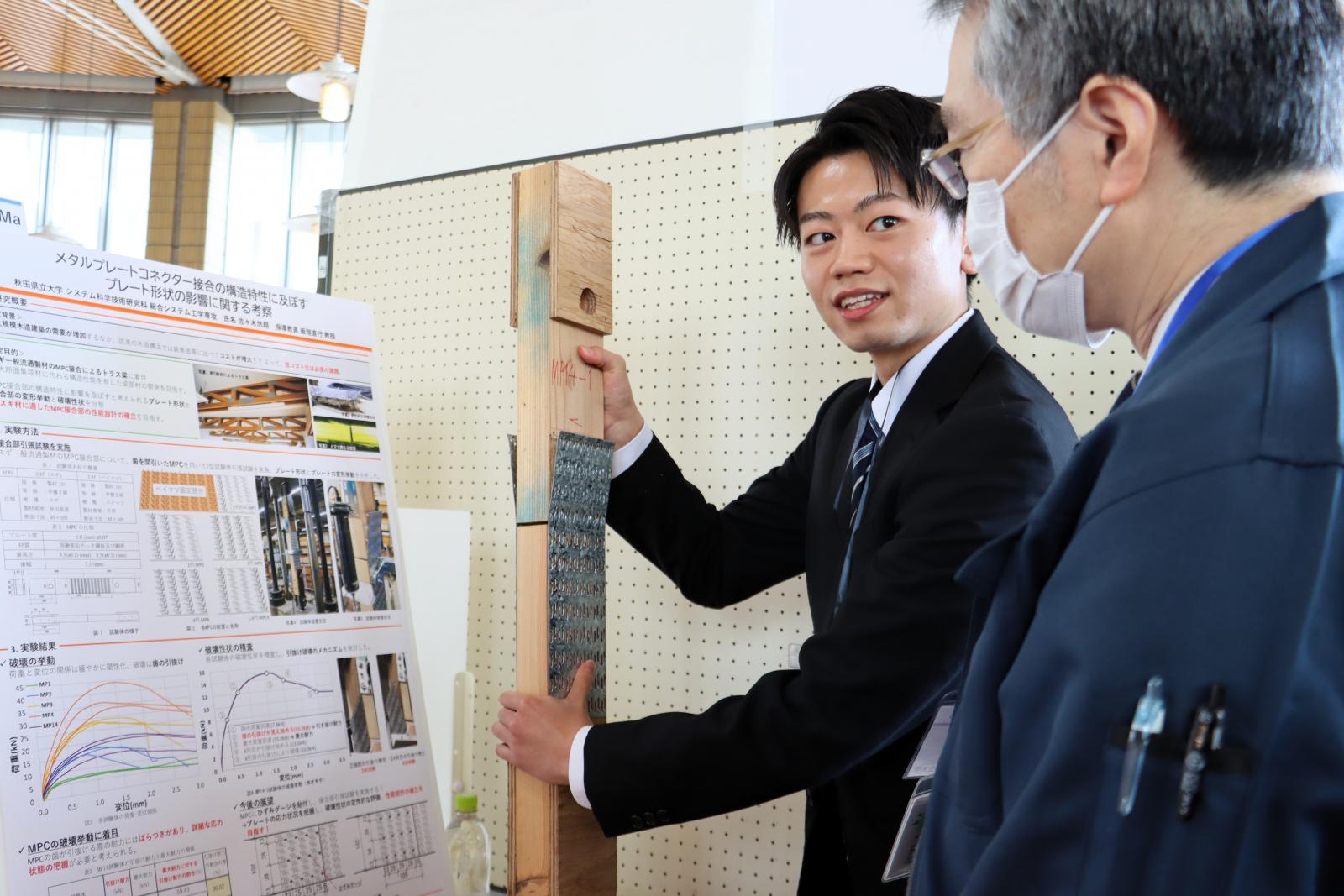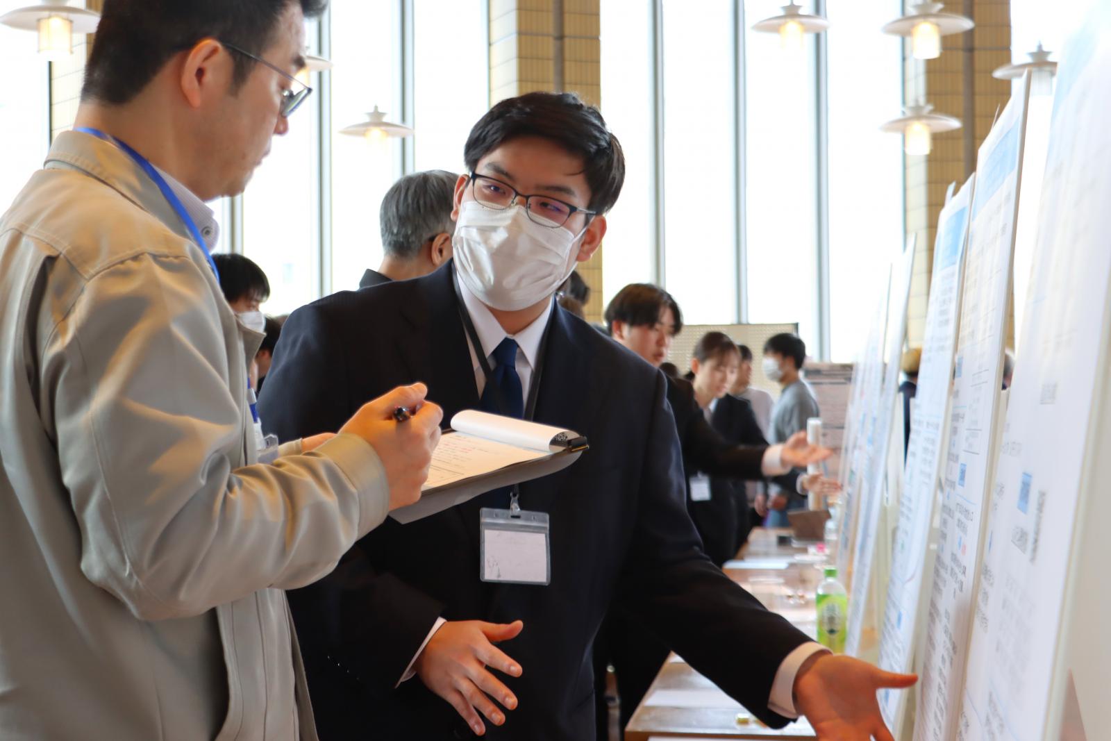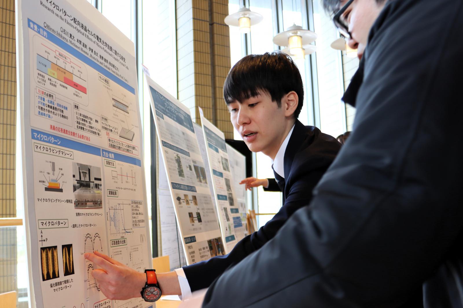 当日は、システム科学技術学部4年生、システム科学技術研究科の学生が、来場した企業技術者など学外の方に向け、卒業研究をはじめとする最新の研究成果をポスター形式でプレゼン発表しました。発表は2グループに分かれ、1時間ごとのコアタイムを設けて発表を行い、広範な業種分野の技術者の皆さんと活発にディスカッションしました。参加した学生からは、「自分の研究分野と異なる分野の企業の方からアドバイスをいただき、新たな気づきを得ることができた」「予想外の質問に戸惑うこともあったが、4年間で培った知識をもとに答えることができた」といった声が寄せられました。学生にとっては、自身の研究を社会にどう役立てるかという視点を再確認する機会となり、研究意欲の向上や新たな課題の発見にも繋がりました。