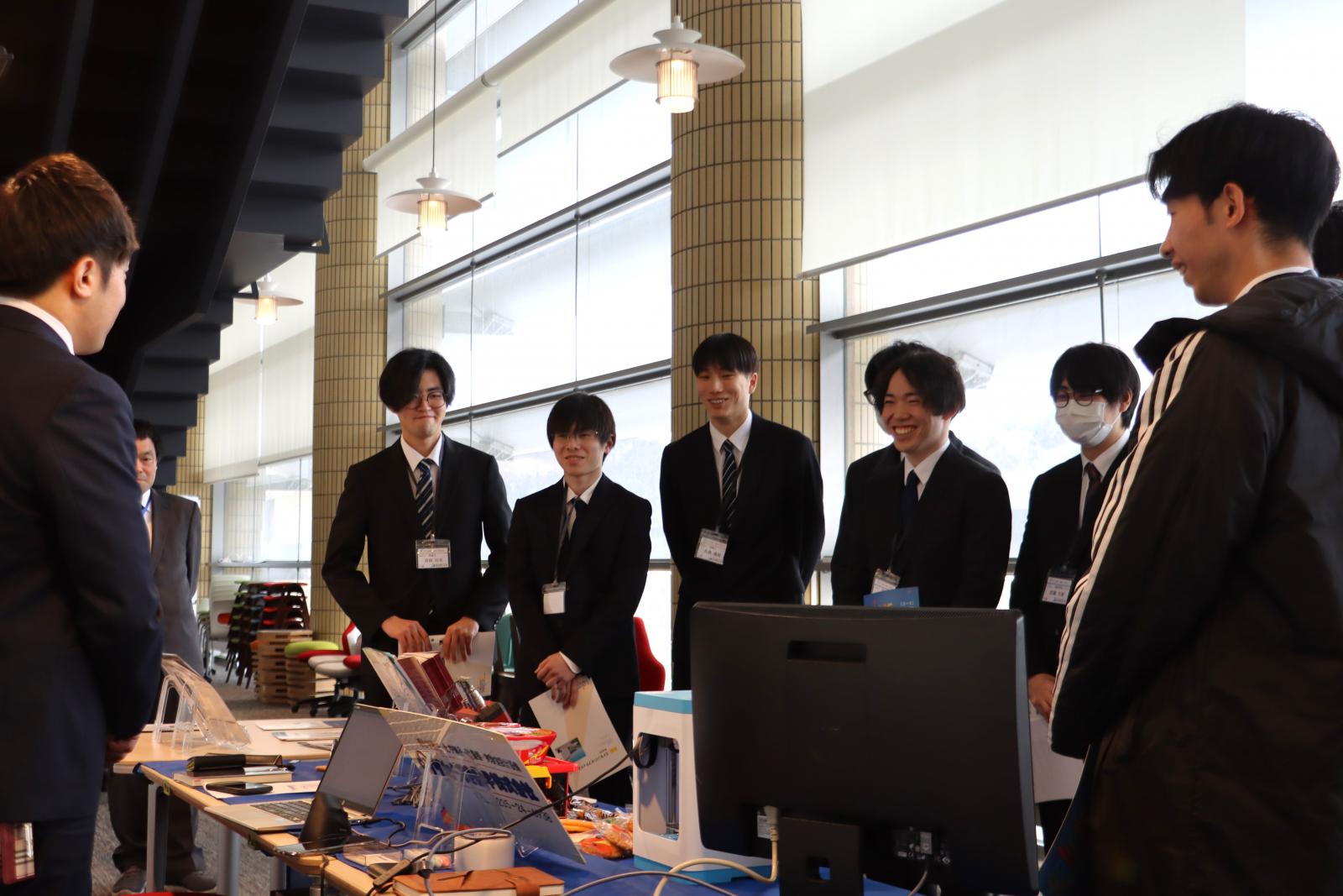 発表会後に行われた企業展示では、地域企業7社より展示ブースを出展いただき、自社の事業内容や求める人材、活躍の場について詳しくご説明いただきました。学生はブースでの説明に真剣に耳を傾け、企業や産業界の現状を知ることのできる良い機会になりました。お忙しい中ご参加いただいた企業の皆様、誠にありがとうございました。表彰式