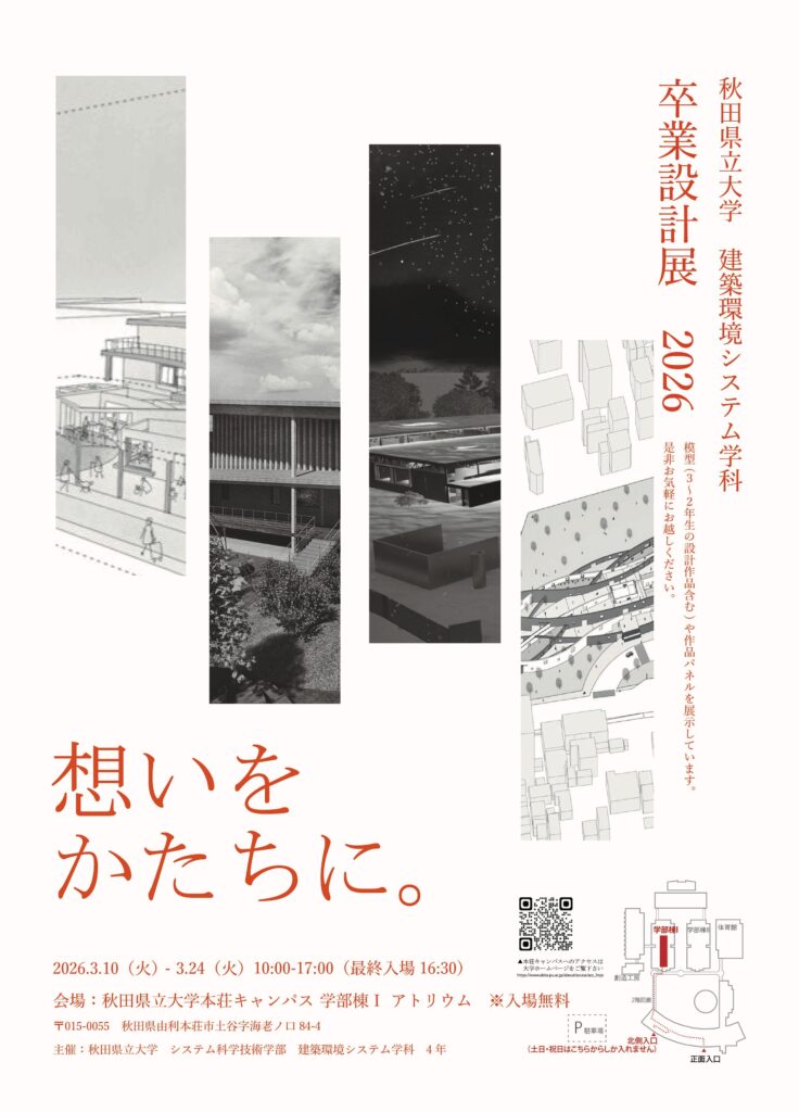 一般市民の皆さまはもちろん、建築に関心をお持ちの高校生以下の皆さんや、入学予定の方も、ぜひお時間がございましたら本荘キャンパスへお立ち寄りください。