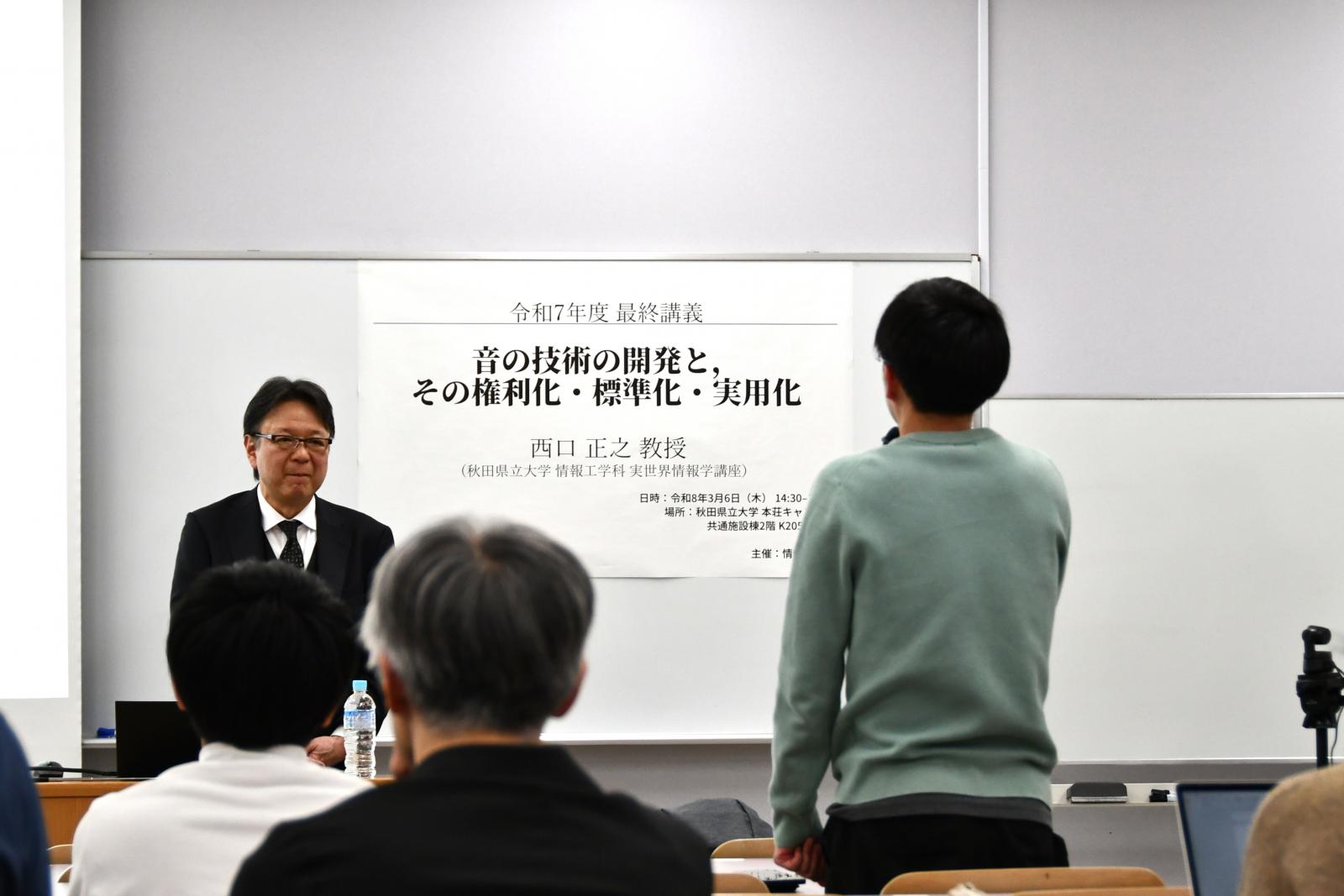 令和8年3月6日(金)、本学システム科学技術学部において、情報工学科 教授 西口正之先生の最終講義が開催されました。「音の技術の開発と、その権利化・標準化・実用化」と題した講義では、これまでの歩みと研究についてお話しいただきました。カリフォルニア大学への留学当初は、言葉や授業理解に苦労されながらも、努力を重ねる中で徐々に理解を深め、研究に打ち込まれていったご経験が印象的に語られました。現地では研究室に所属し、ベクトル量子化技術の研究に取り組まれ、その後は滞在期間を延長して研究をさらに発展させてこられました。