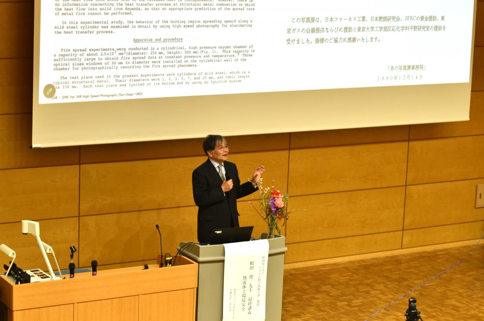 また、リチウムイオン電池の事故や火災の調査、災害時に求められる安全性や信頼性の検討、燃焼の広がりに関する研究など、多方面にわたるご研究についても紹介されました。学会活動などを通じて、学術および社会への貢献にも大きな役割を果たされてきました。