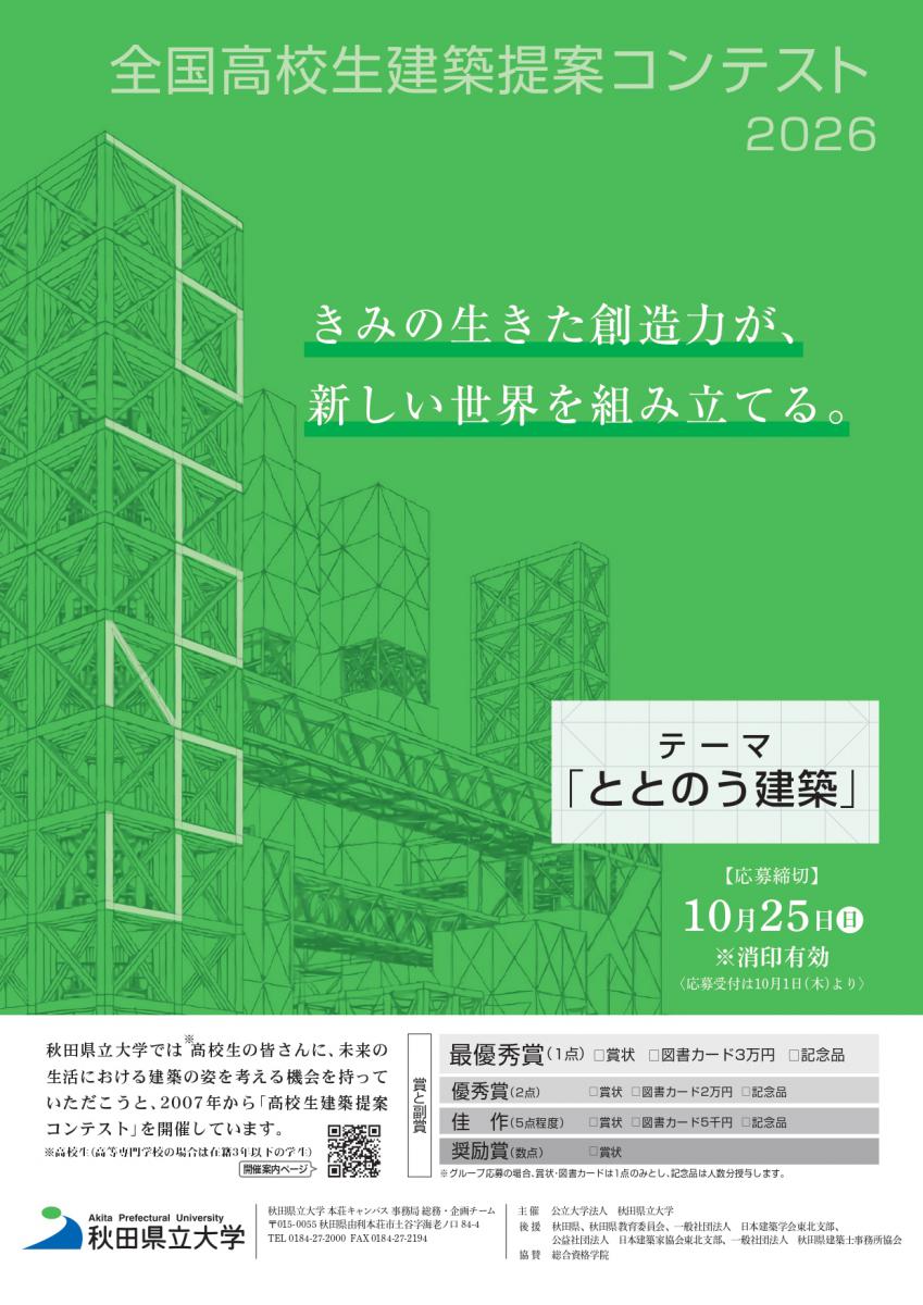 秋田県立大学では高校生*の皆さんを対象に、未来の生活における建築の姿を考える機会を持っていただこうと、2007年から「高校生建築提案コンテスト」を開催しております。記念すべき20回目となる今回は「ととのう建築」をテーマに、建築的なアイデアを募集します。 *高等専門学校の場合は在籍3年以下の学生