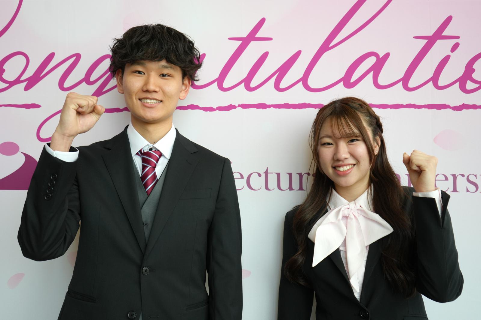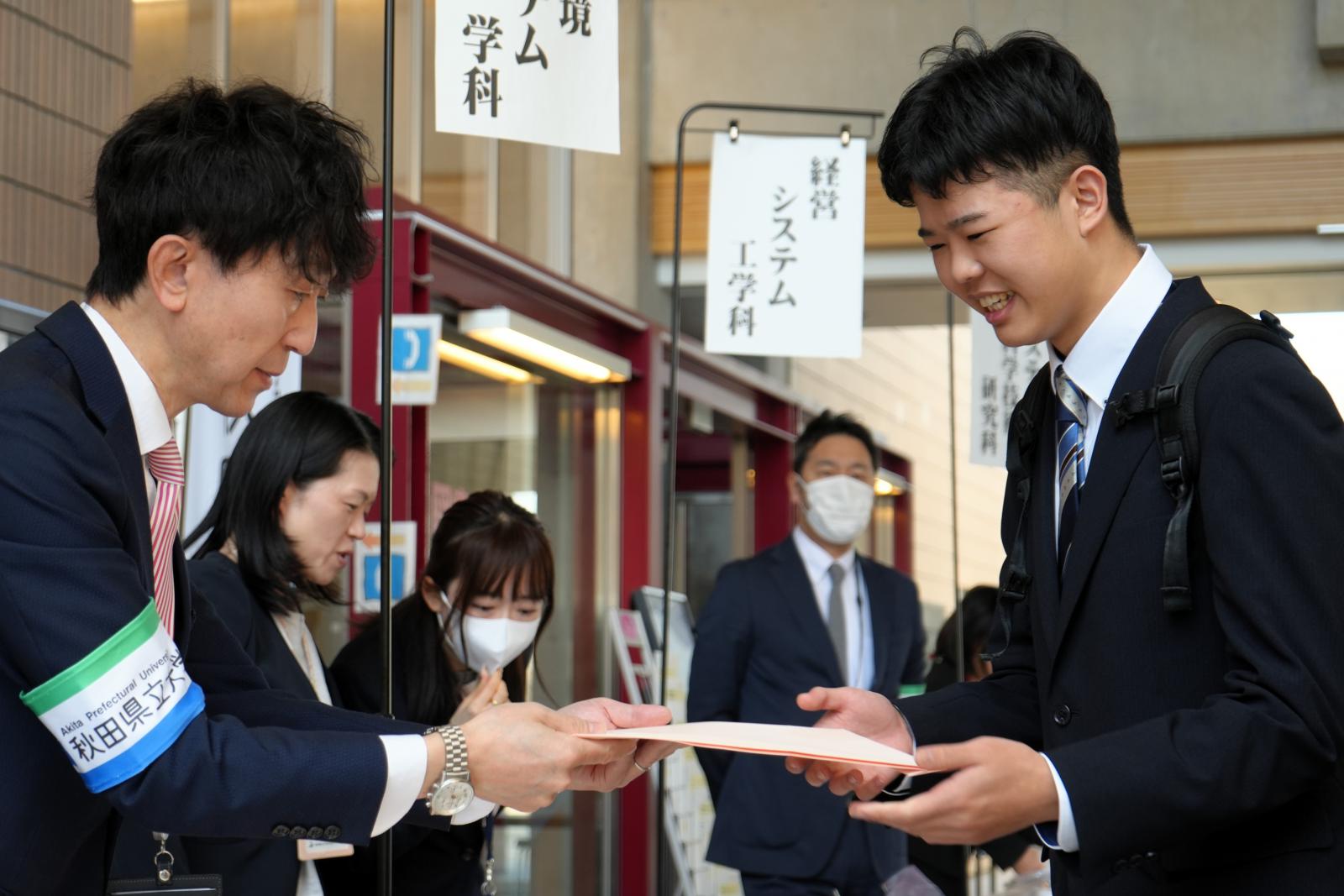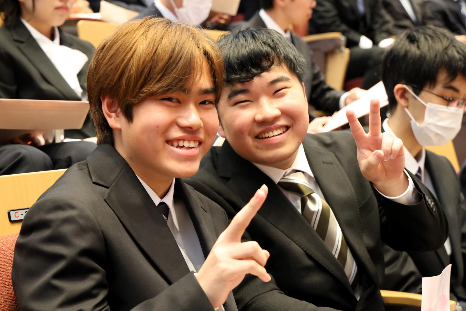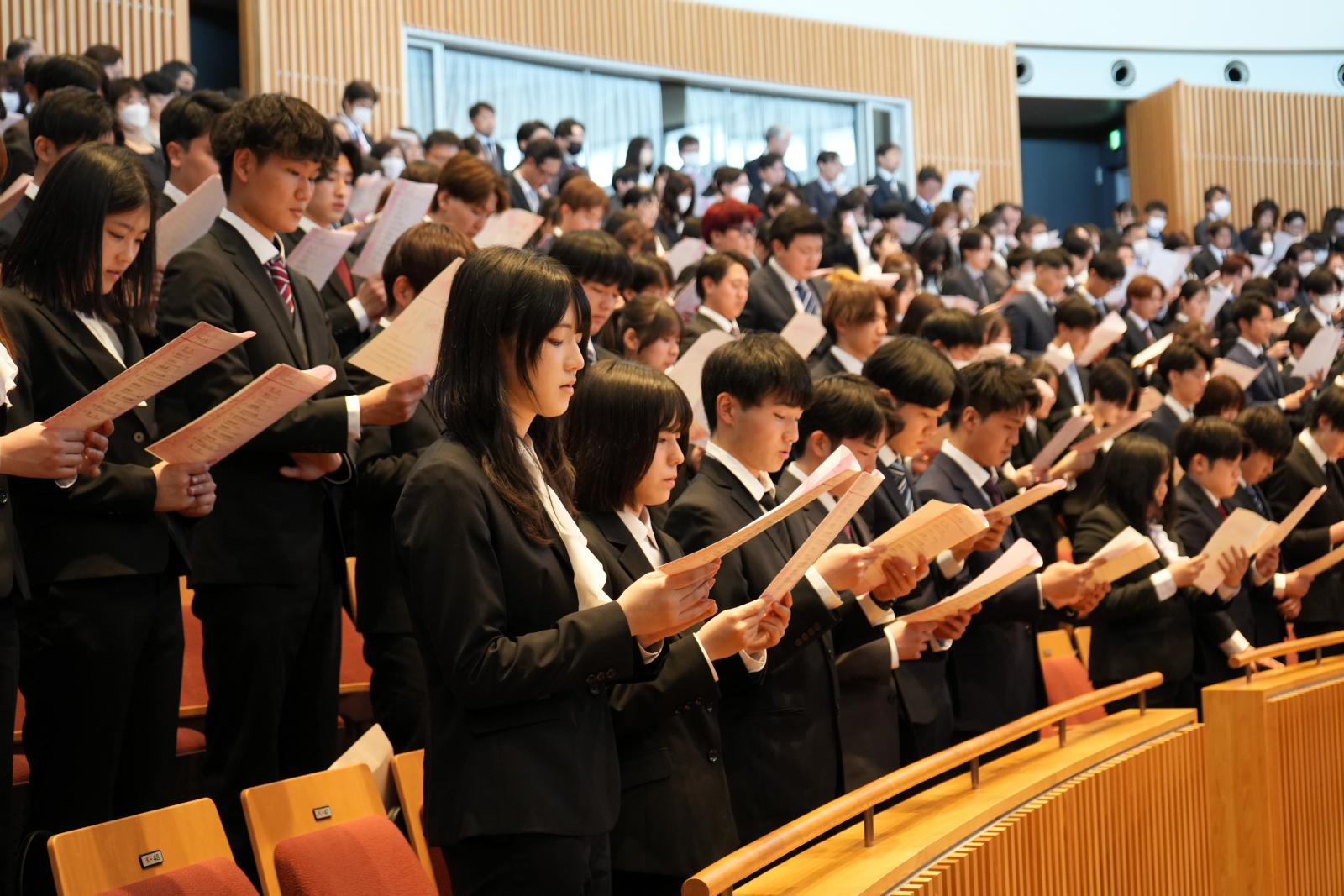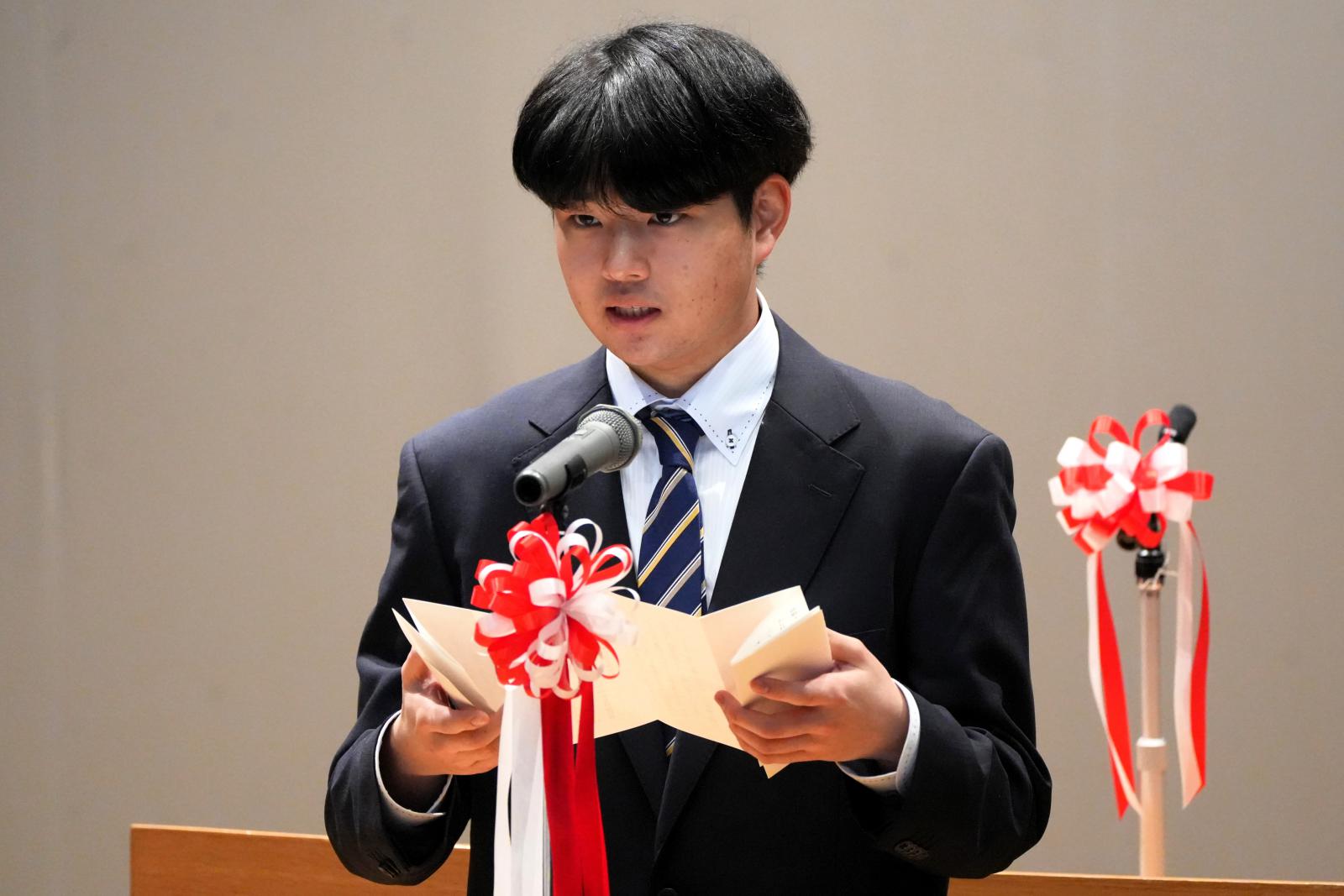 また新入生を代表して、生物資源科学部 生物環境科学科の 山谷 由佳 さん(秋田県/秋田南高校)が「日々の発見・感動を大切にしながら、常に未来の大きな目標を見据えて勉学に励むとともに、本学学生としての自信と誇りを持って自らを向上させ、先輩たちとともに本学の無限の可能性を切り拓いていくことを誓います」と力強く宣誓すると、在学生代表のシステム科学技術学部 建築環境システム学科4年 佐々木 耀淳 さんが「新しい環境では不安も大きいと思いますが、失敗を恐れず「やってみたい」という前向きな気持ちを大切にしてください。大きな目標だけでなく、サークルの見学や周囲への日々の挨拶といった身近な一歩も立派な挑戦であり、それらが皆様を大きく成長させます。多くのことに挑戦し、実りあるかけがえのない4年間を築き上げてください。」と新入生に歓迎と激励の言葉を贈りました。